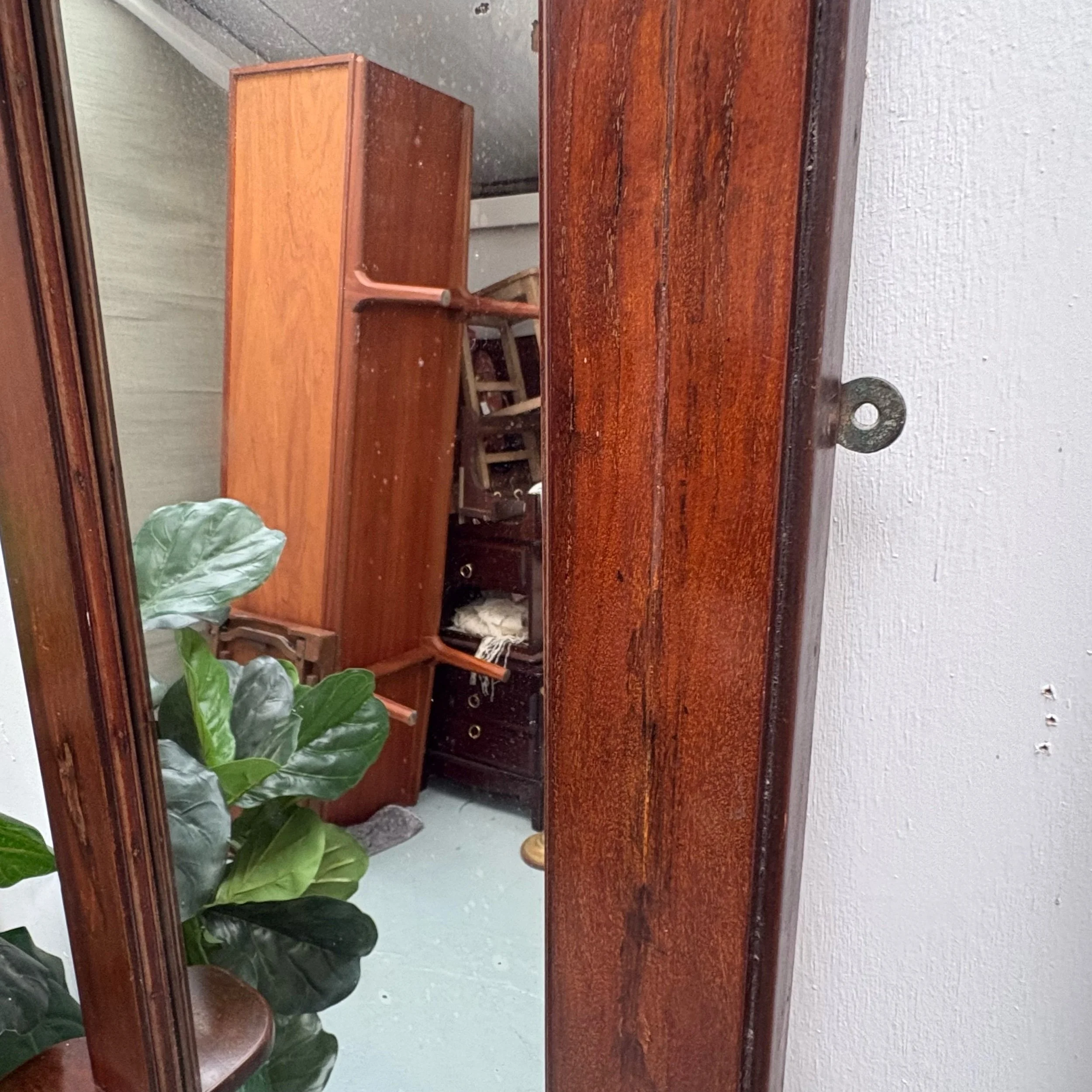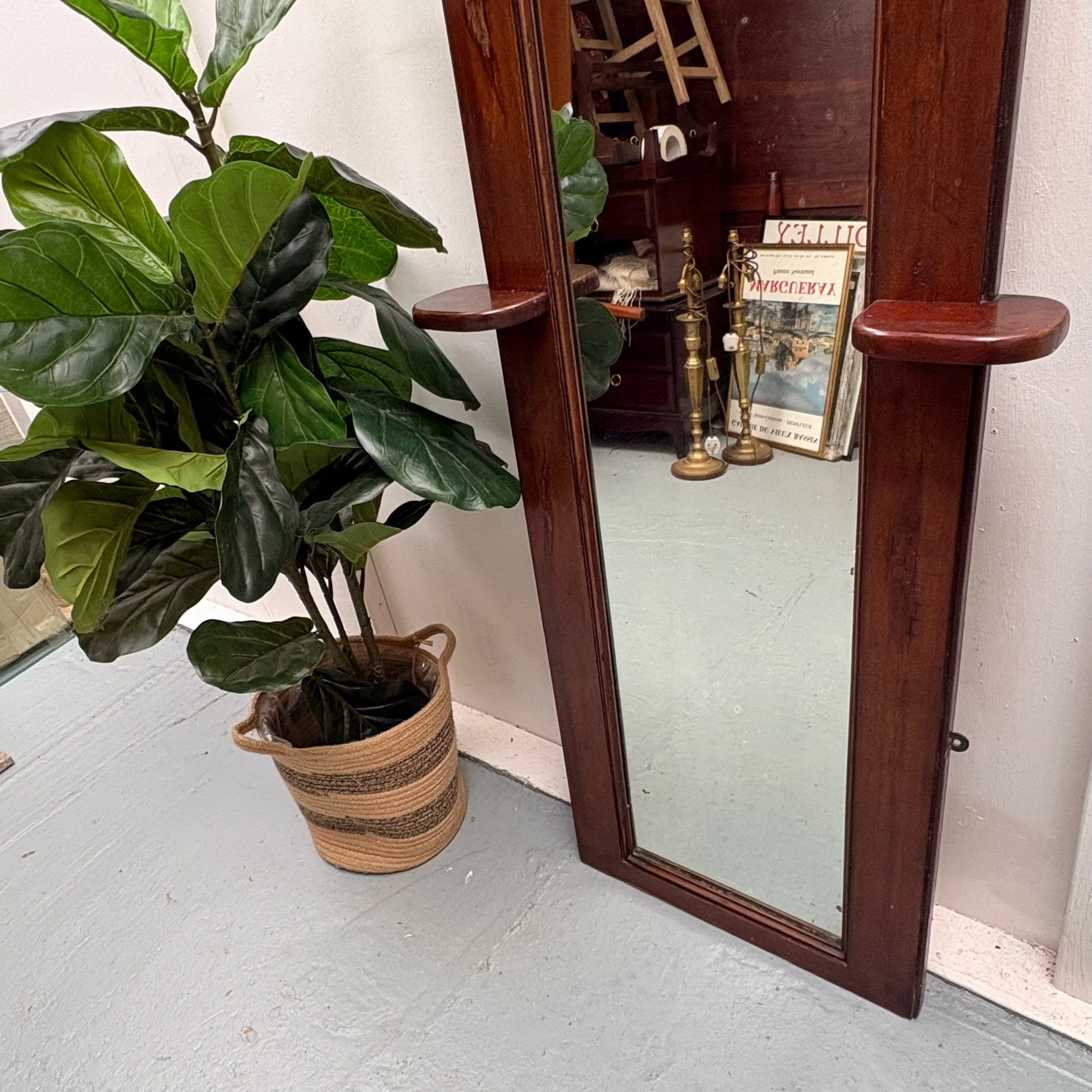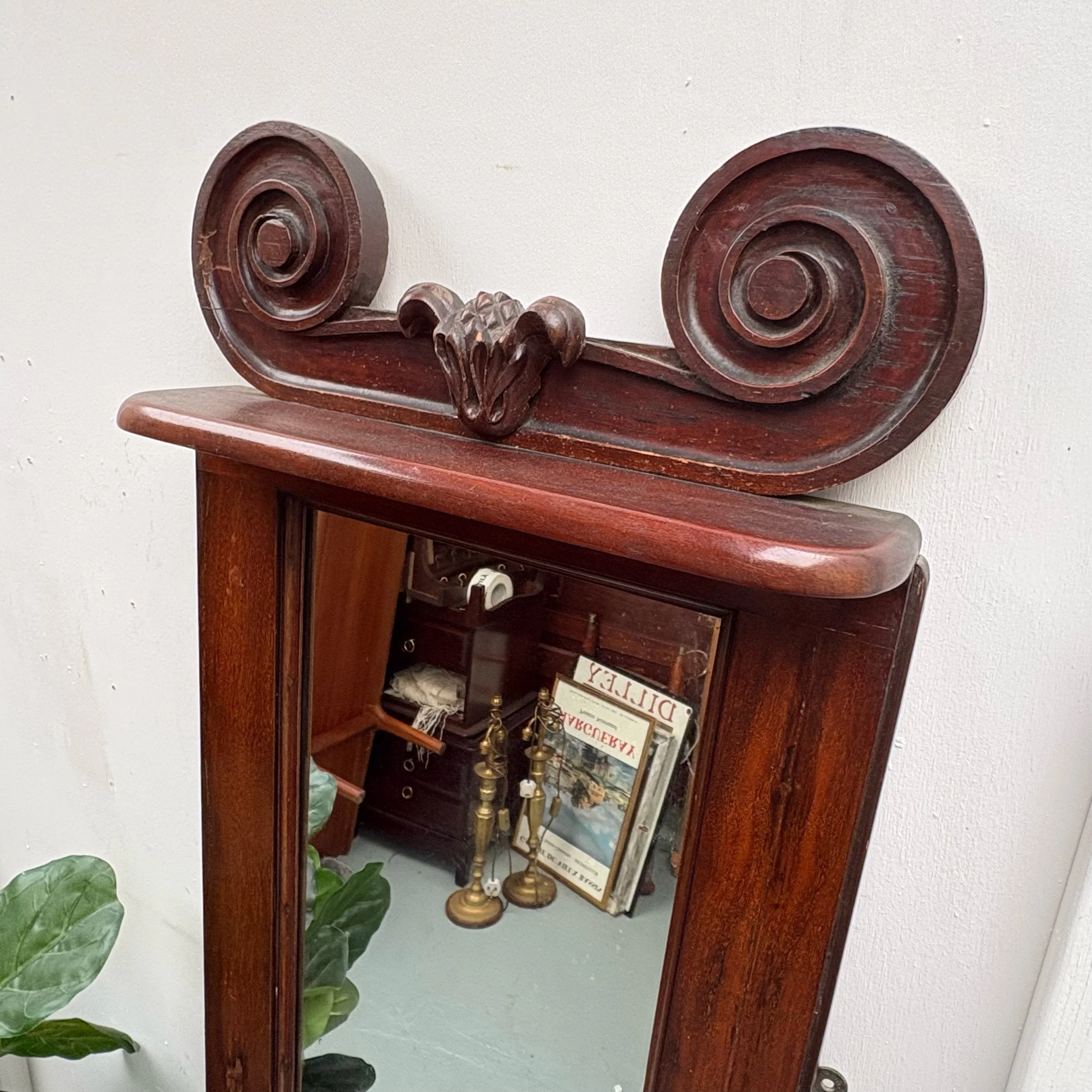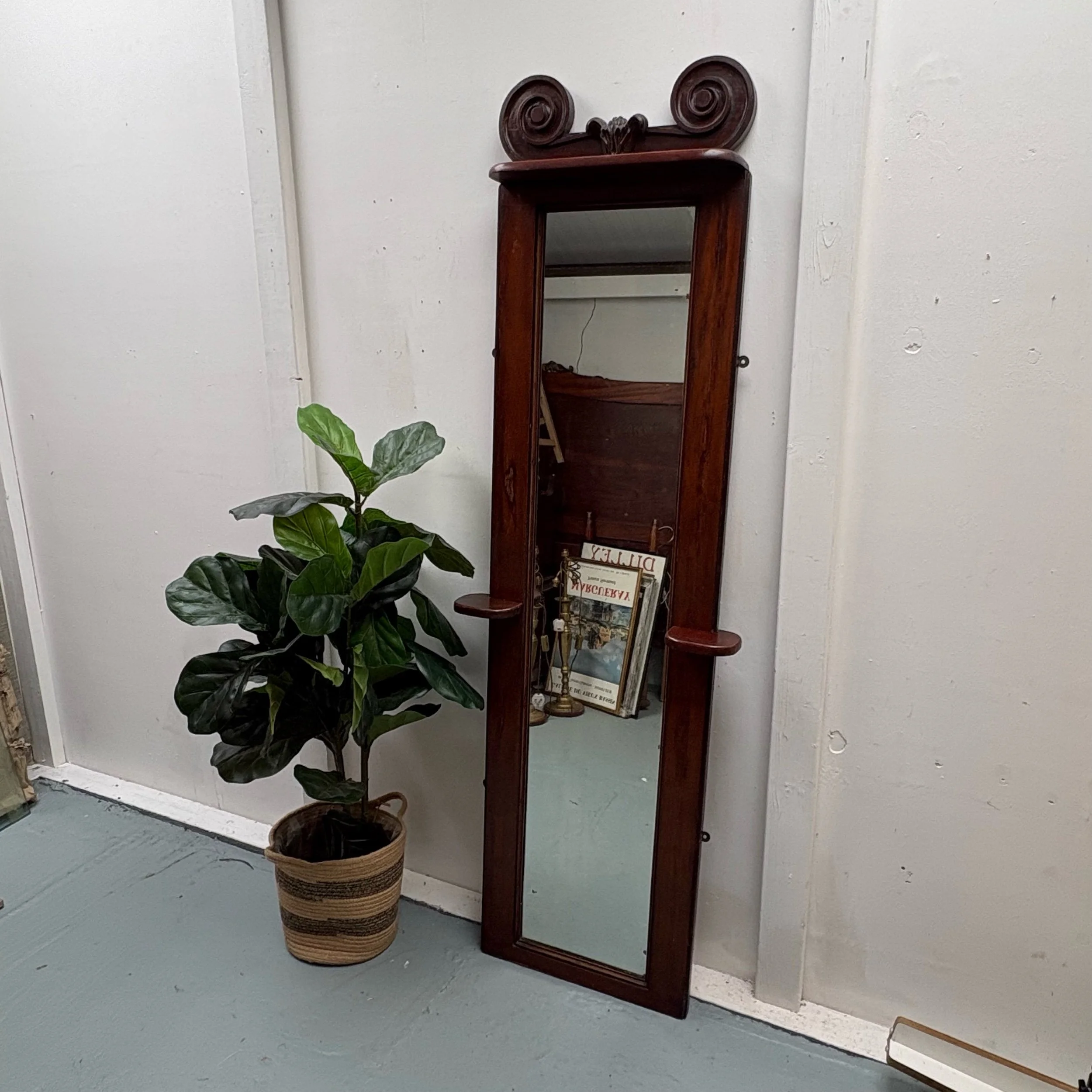 This French Empire Style Mahogany Wall Hall Mirror is an antique piece with a rectangular shape and a mirrored finish.