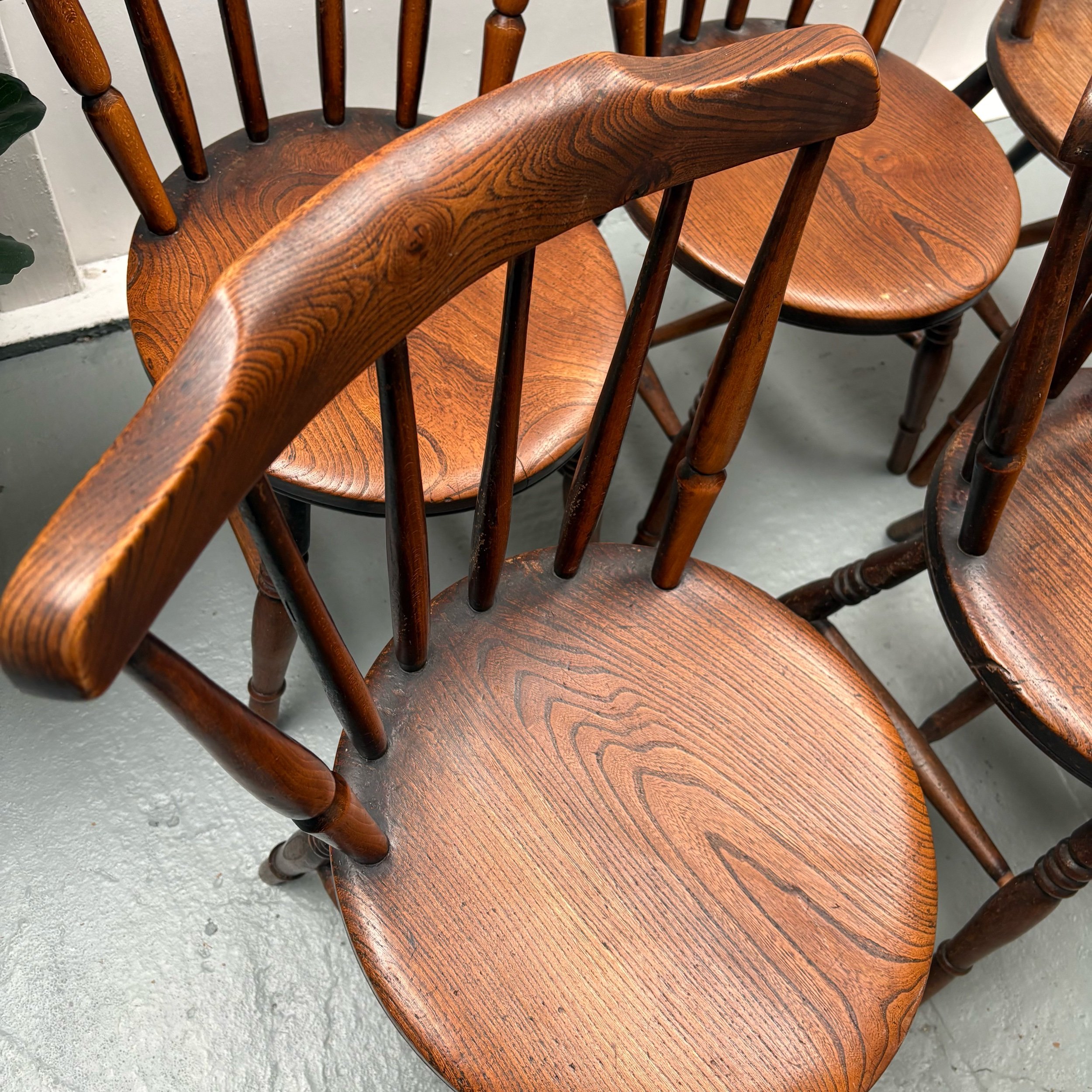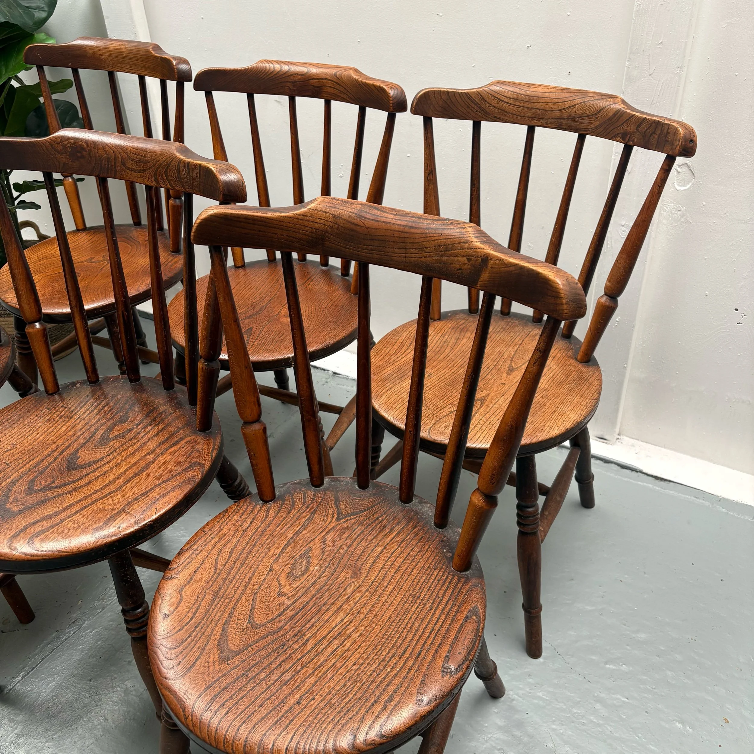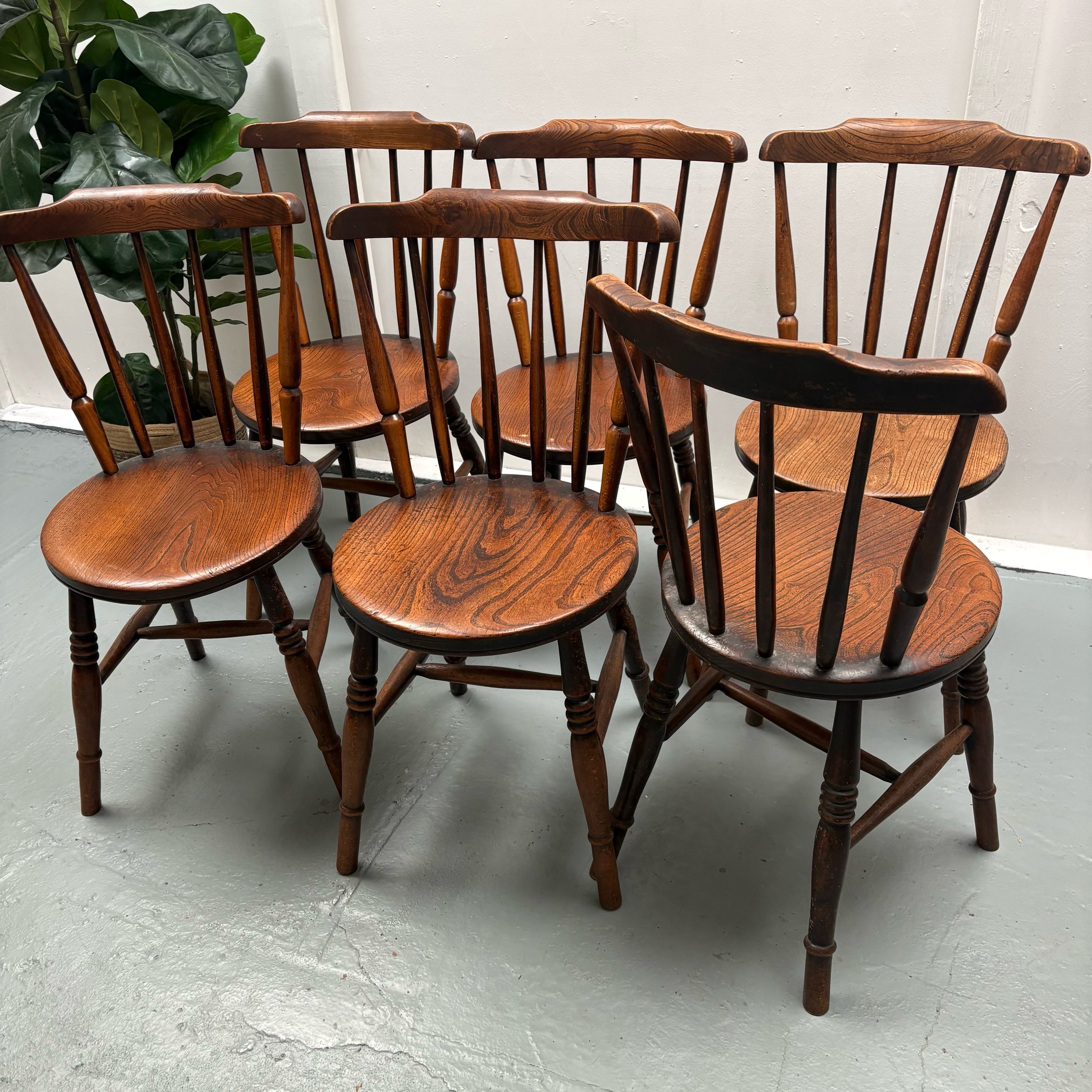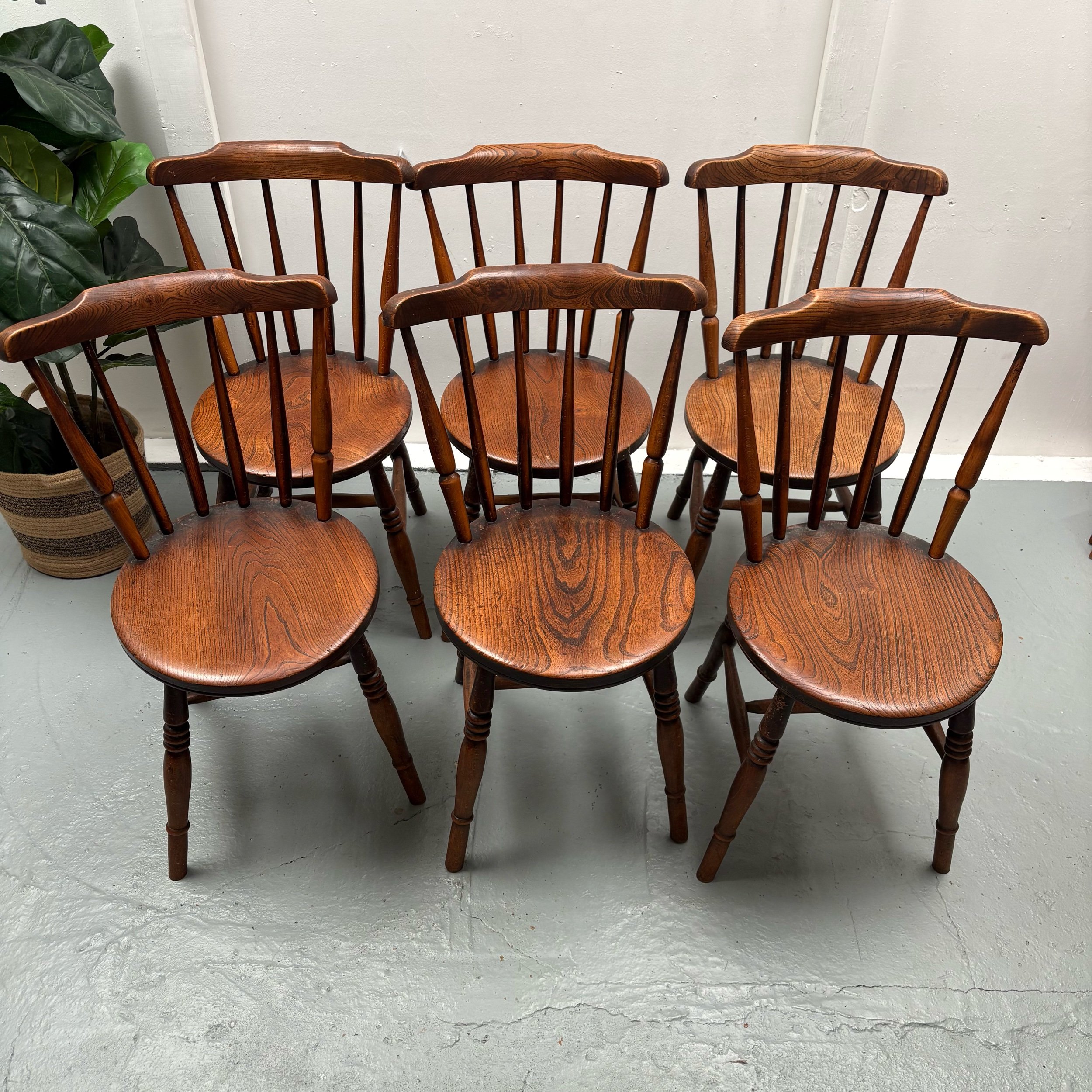 This set of 6 English Elm Windsor-style Spindle Back Kitchen Dining chairs is a timeless and elegant addition to any kitchen or dining room.