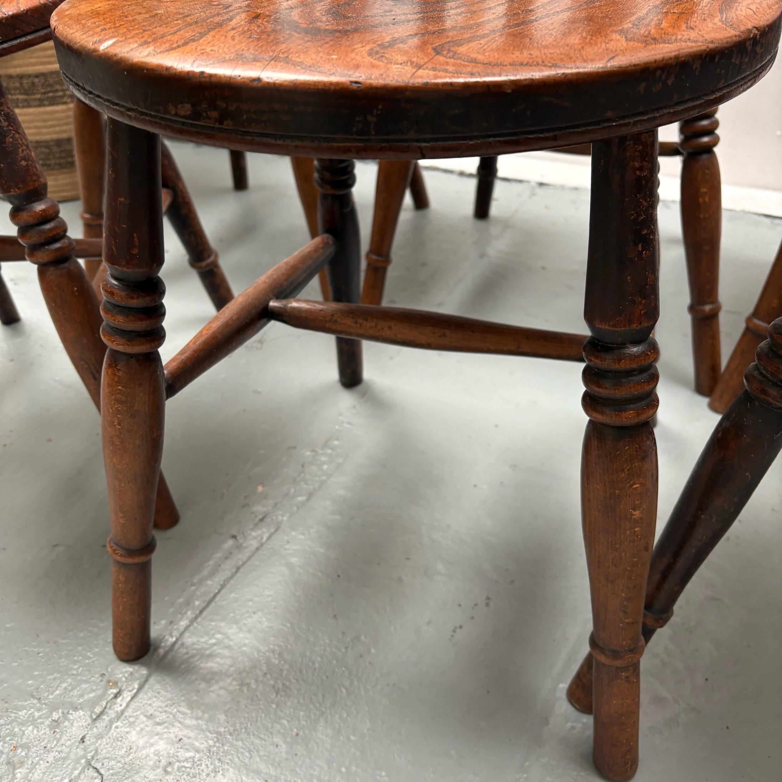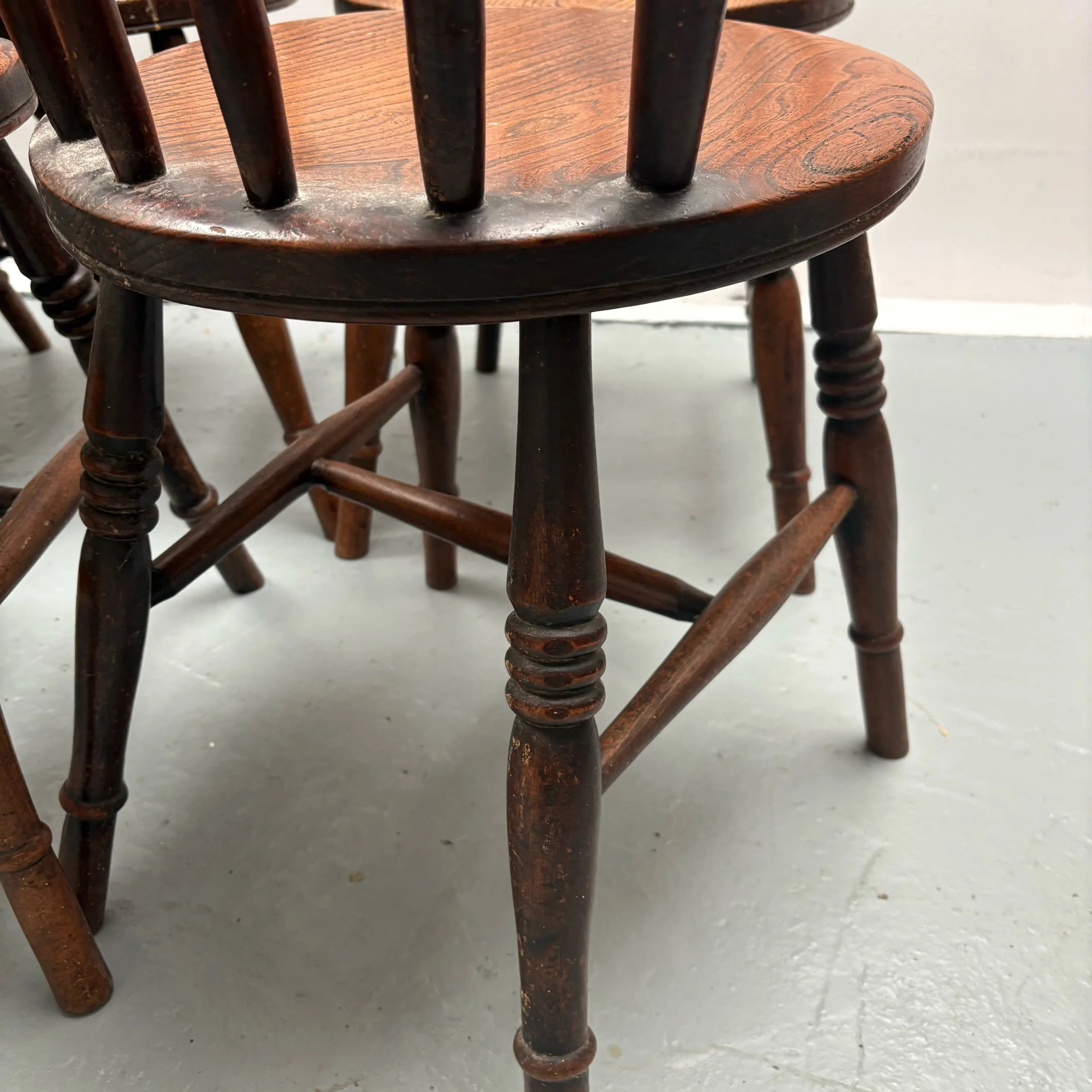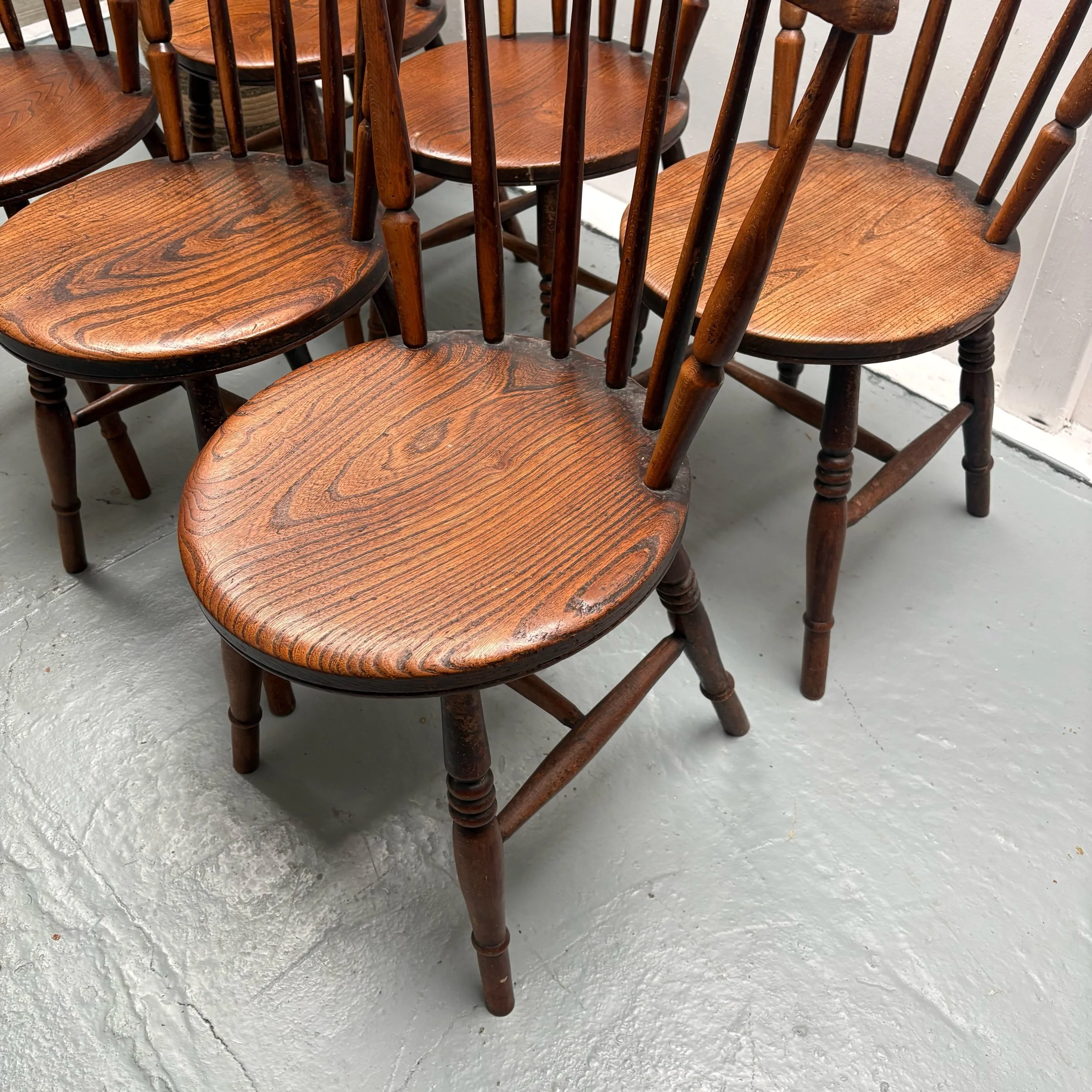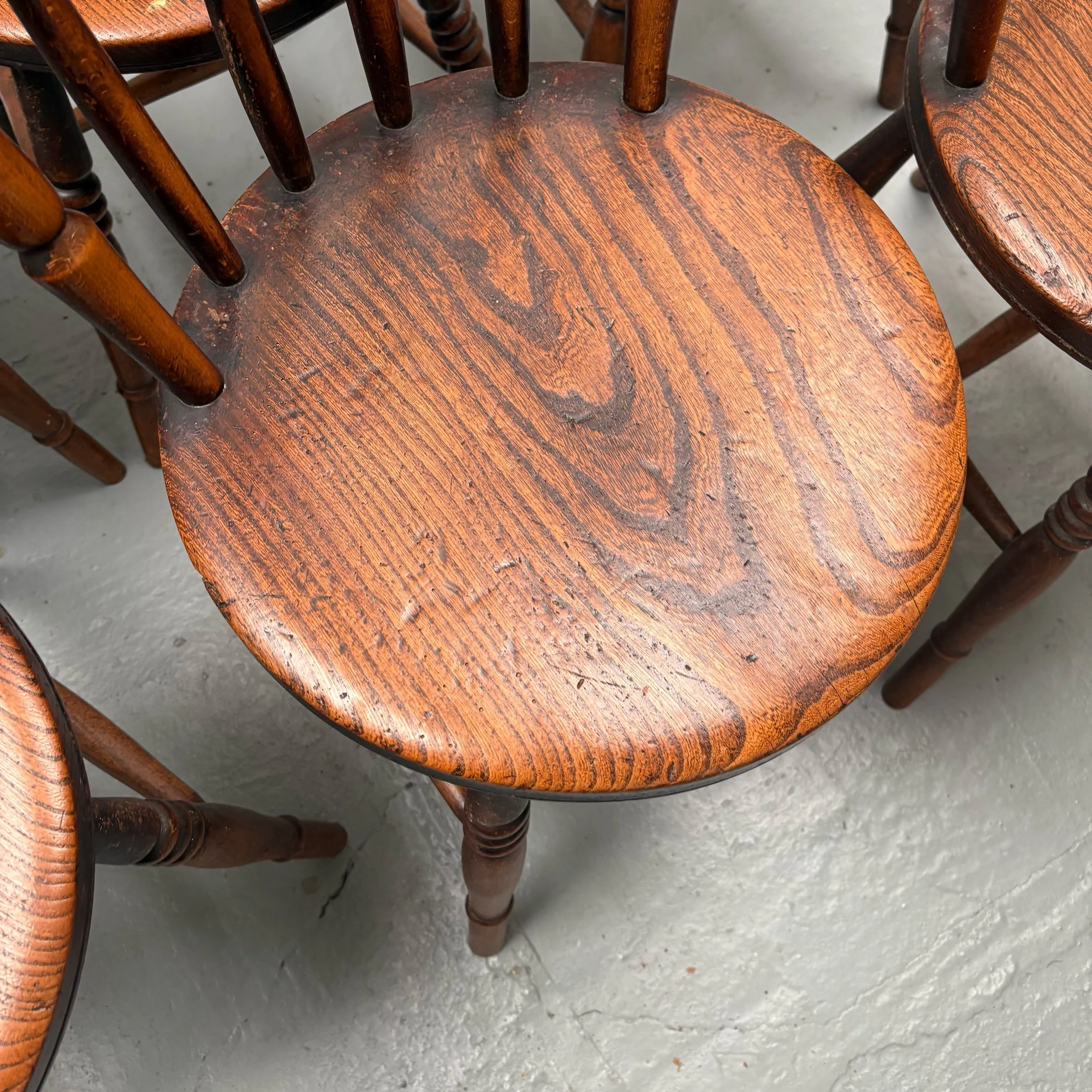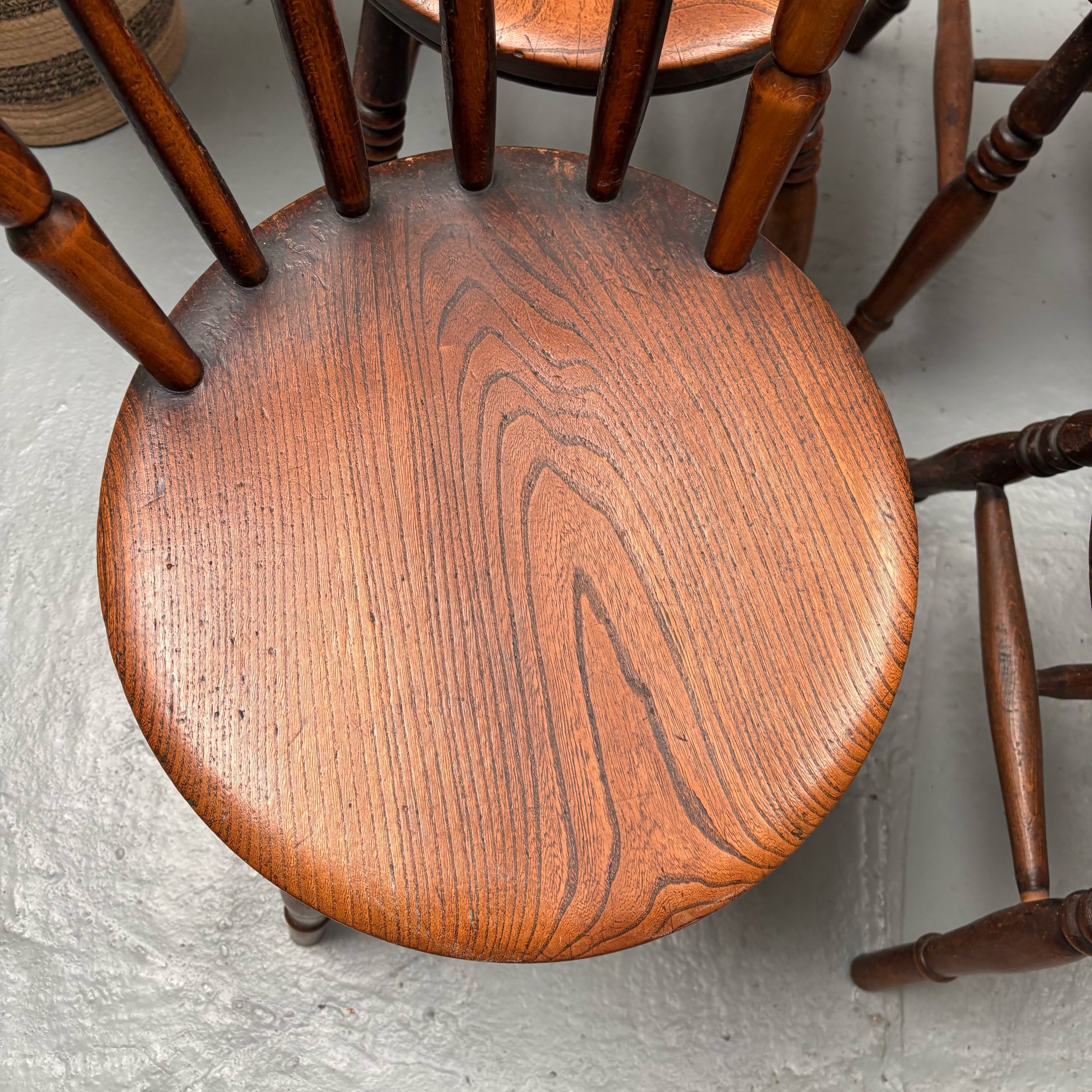 This set of 6 English Elm Windsor-style Spindle Back Kitchen Dining chairs is a timeless and elegant addition to any kitchen or dining room.
