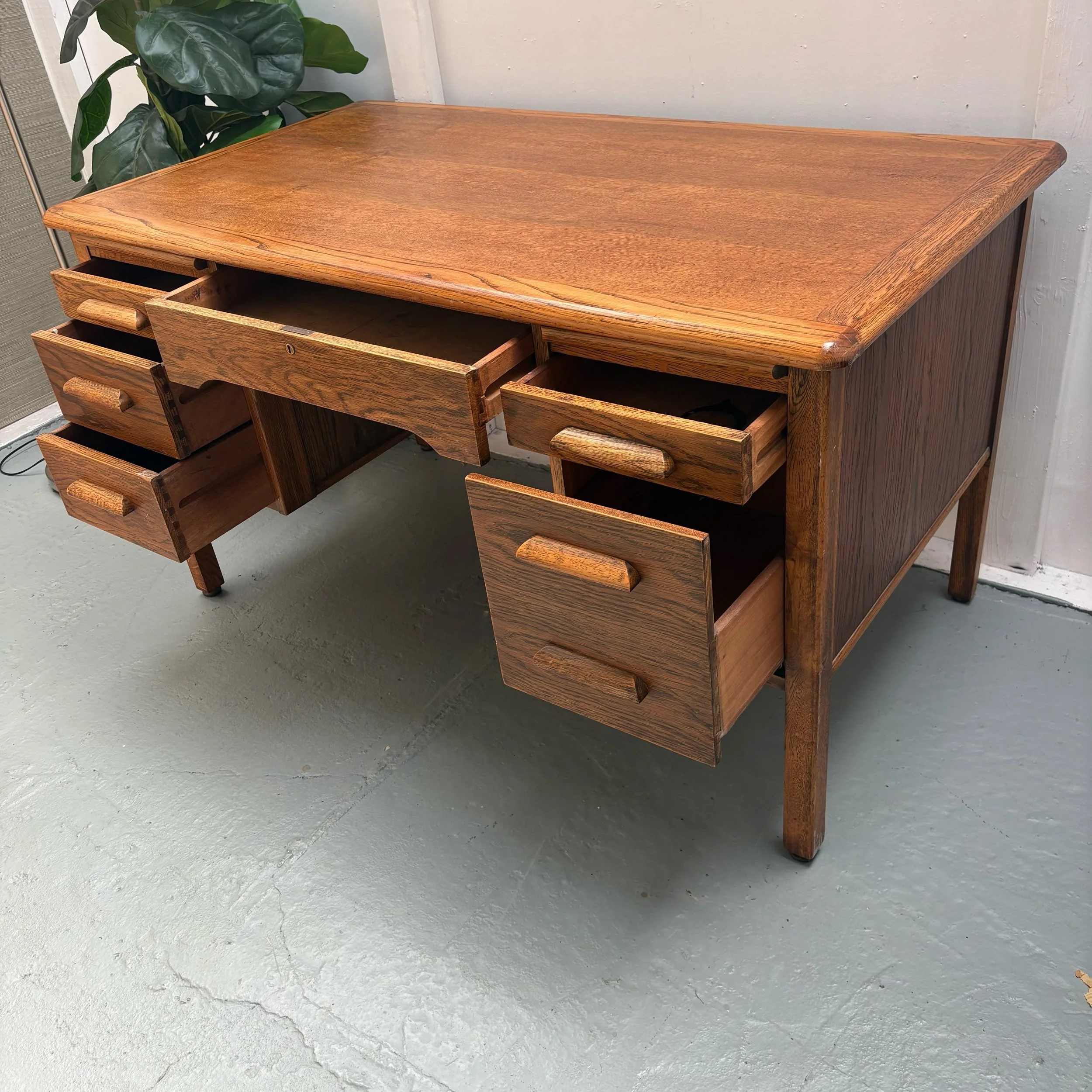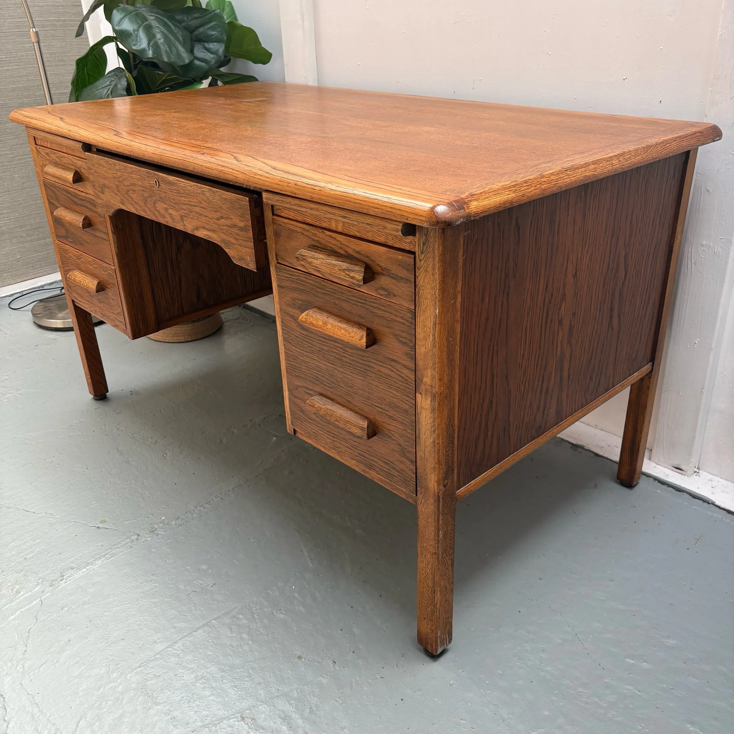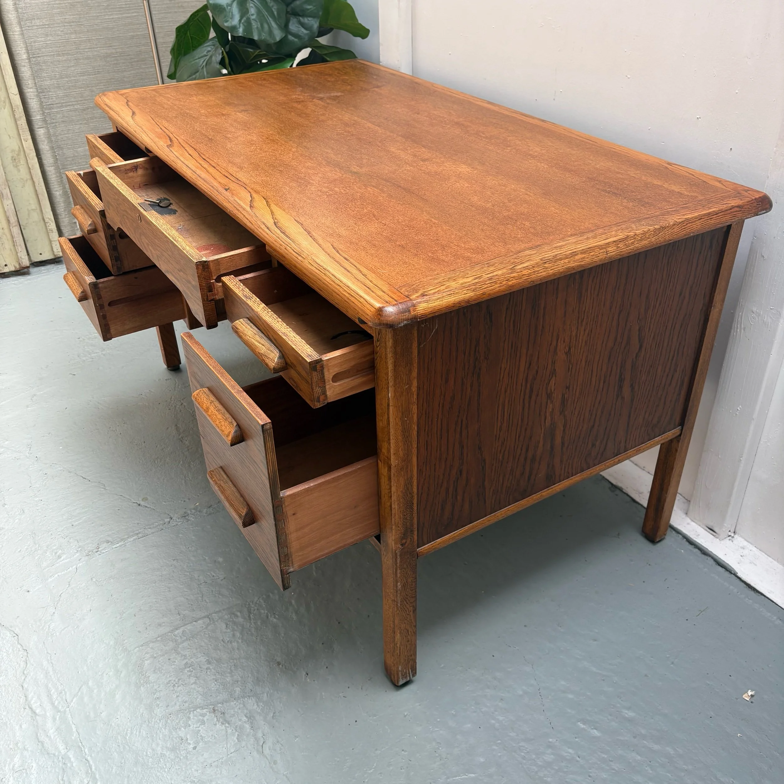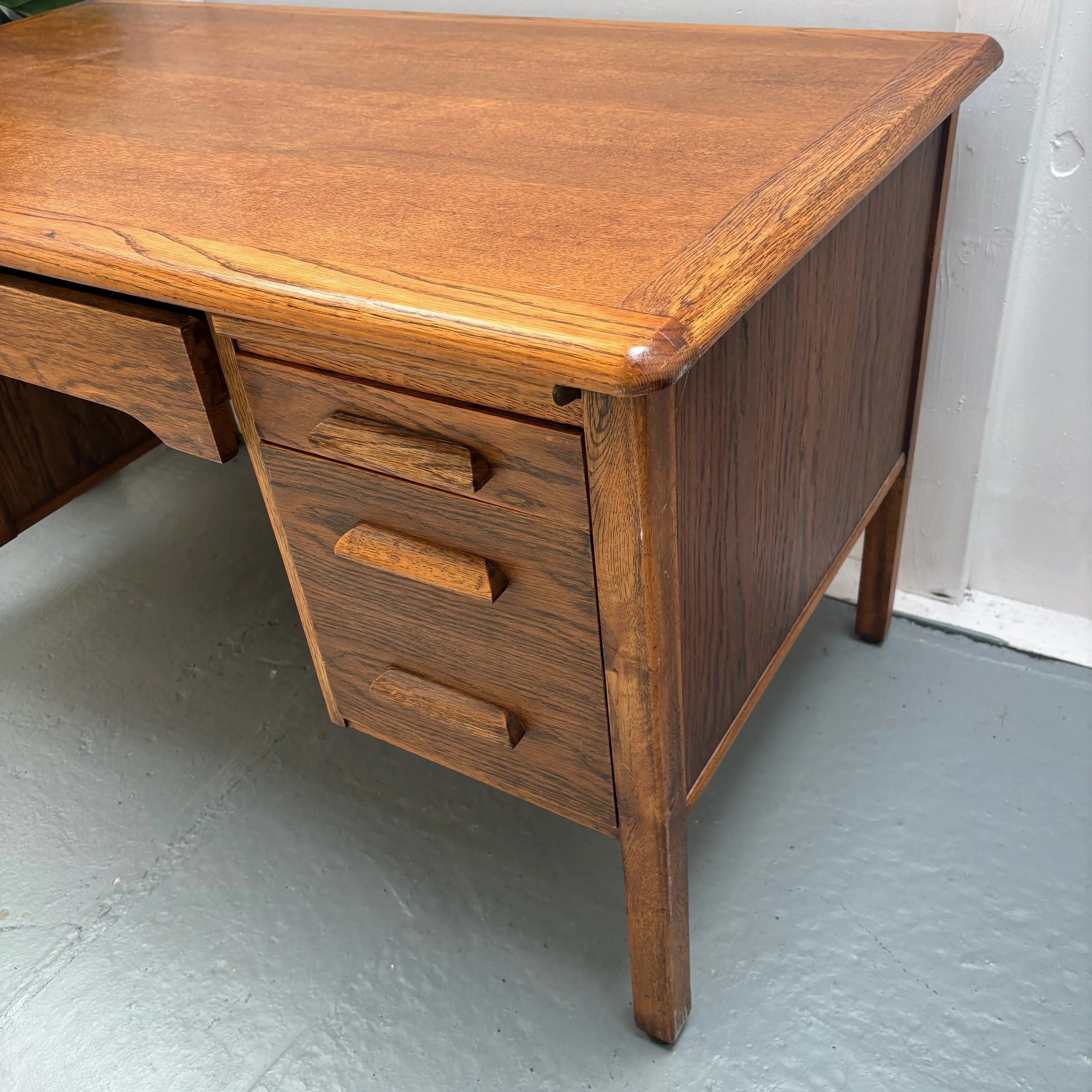 The Vintage Mid Century Abbess Model 512 Oak Twin Pedestal School Teachers Desk is a charming piece of retro furniture, perfect for a traditional classroom or study space.