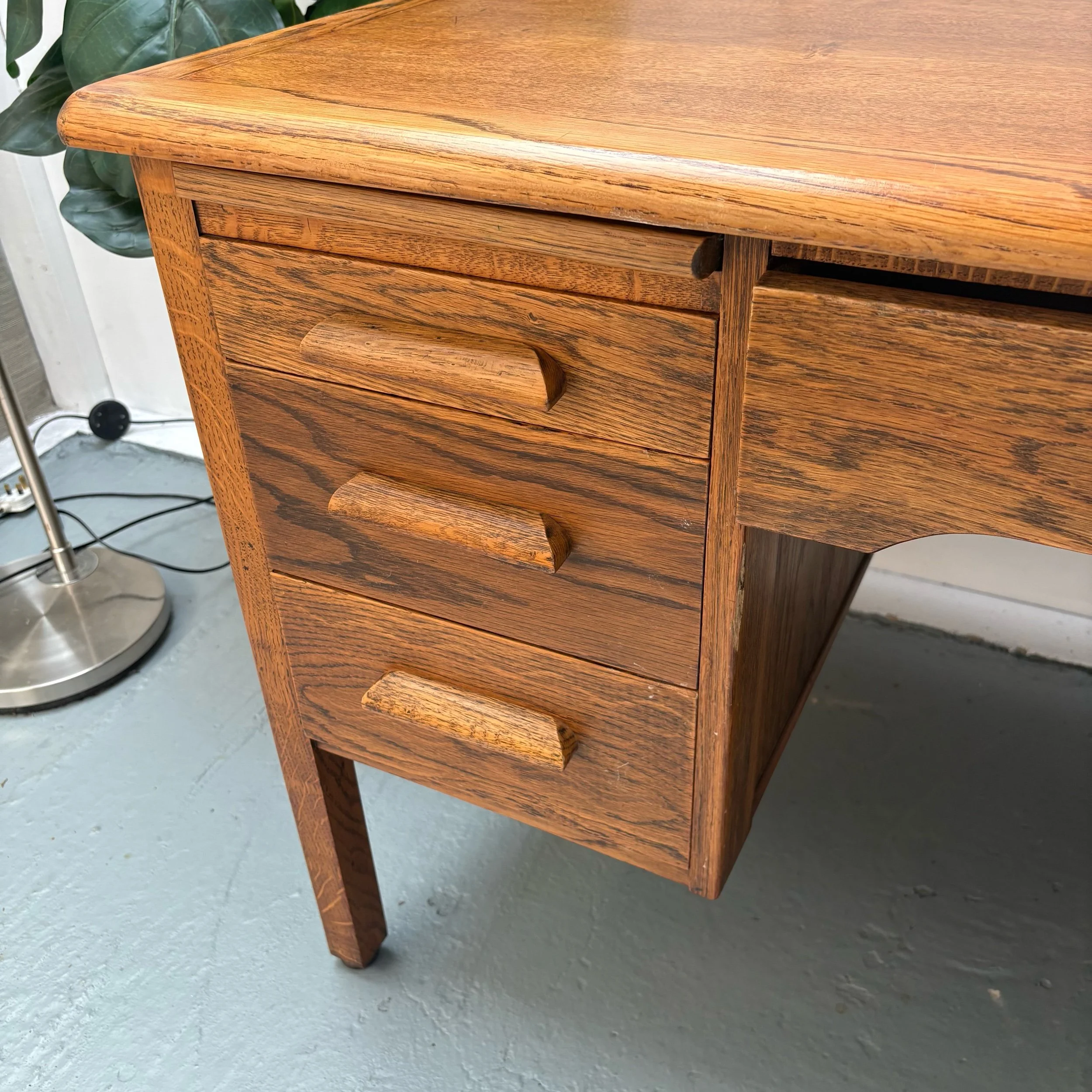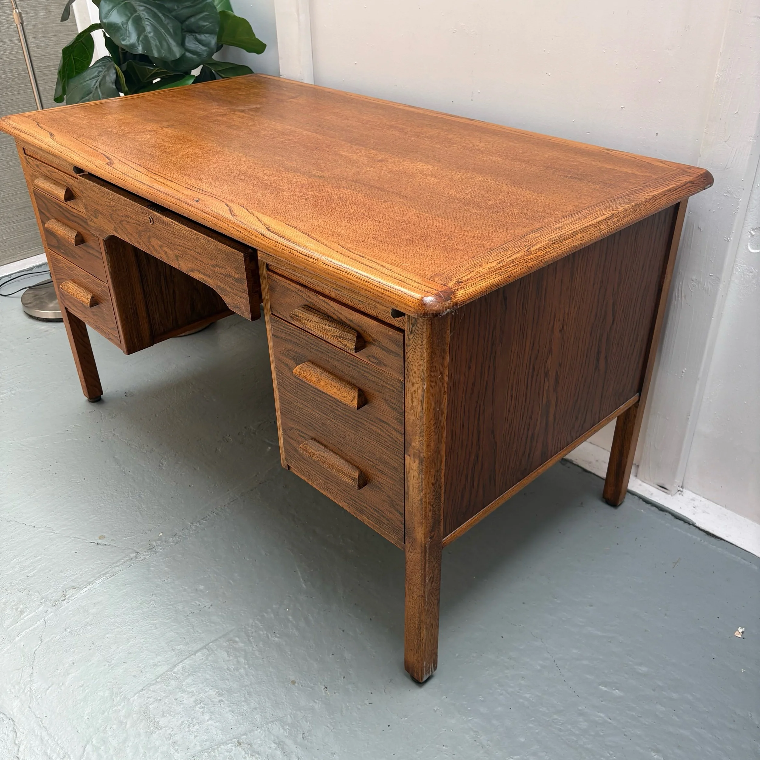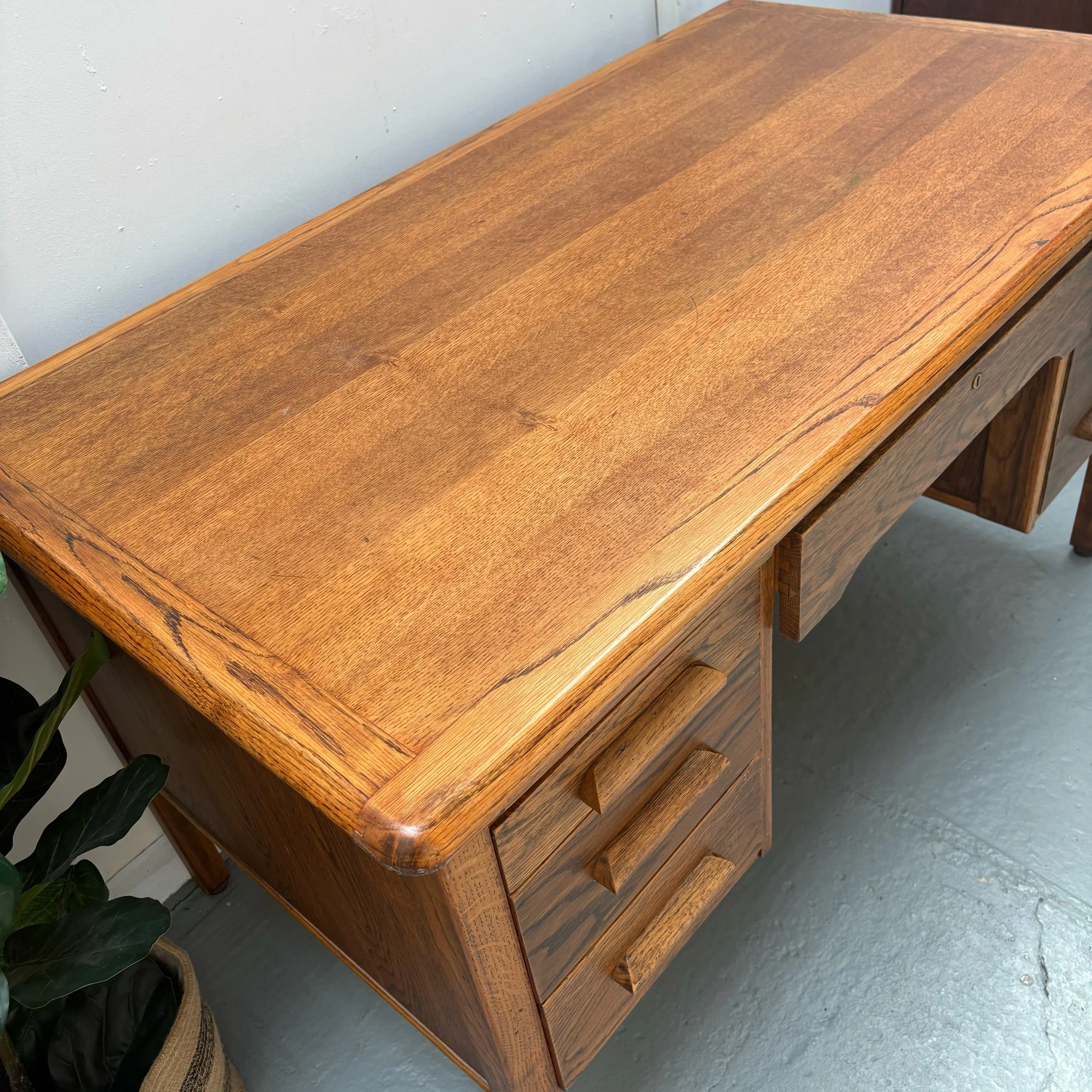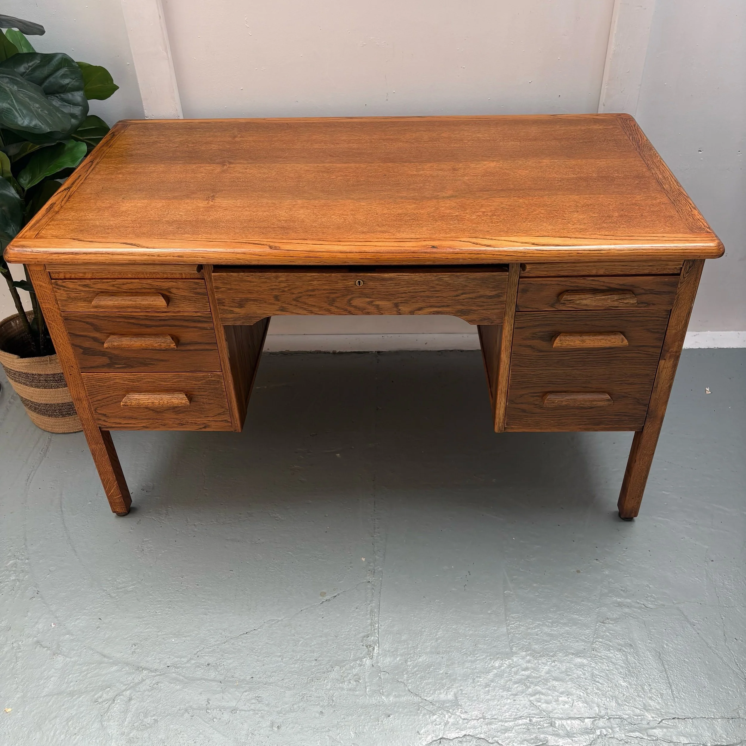 The Vintage Mid Century Abbess Model 512 Oak Twin Pedestal School Teachers Desk is a charming piece of retro furniture, perfect for a traditional classroom or study space.
