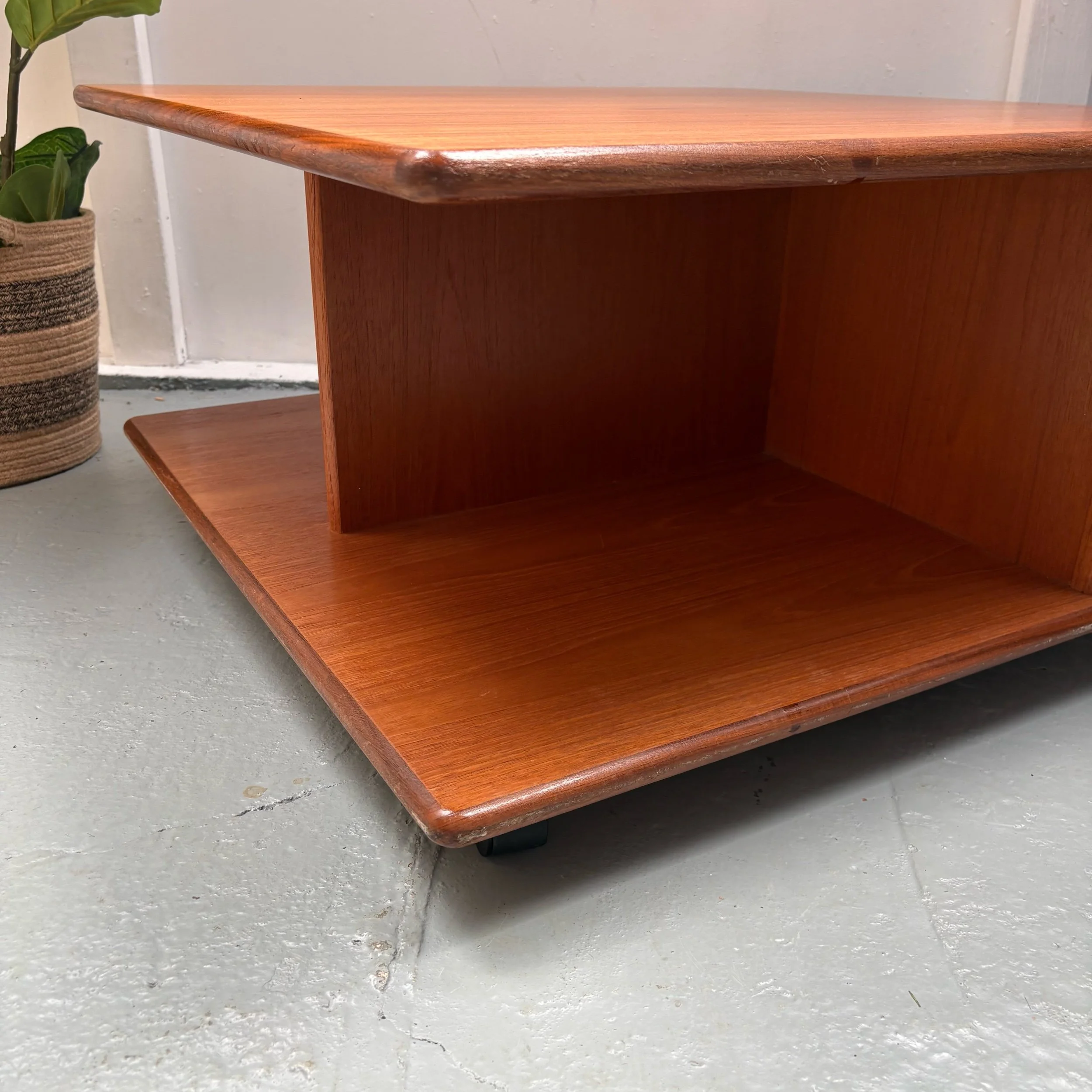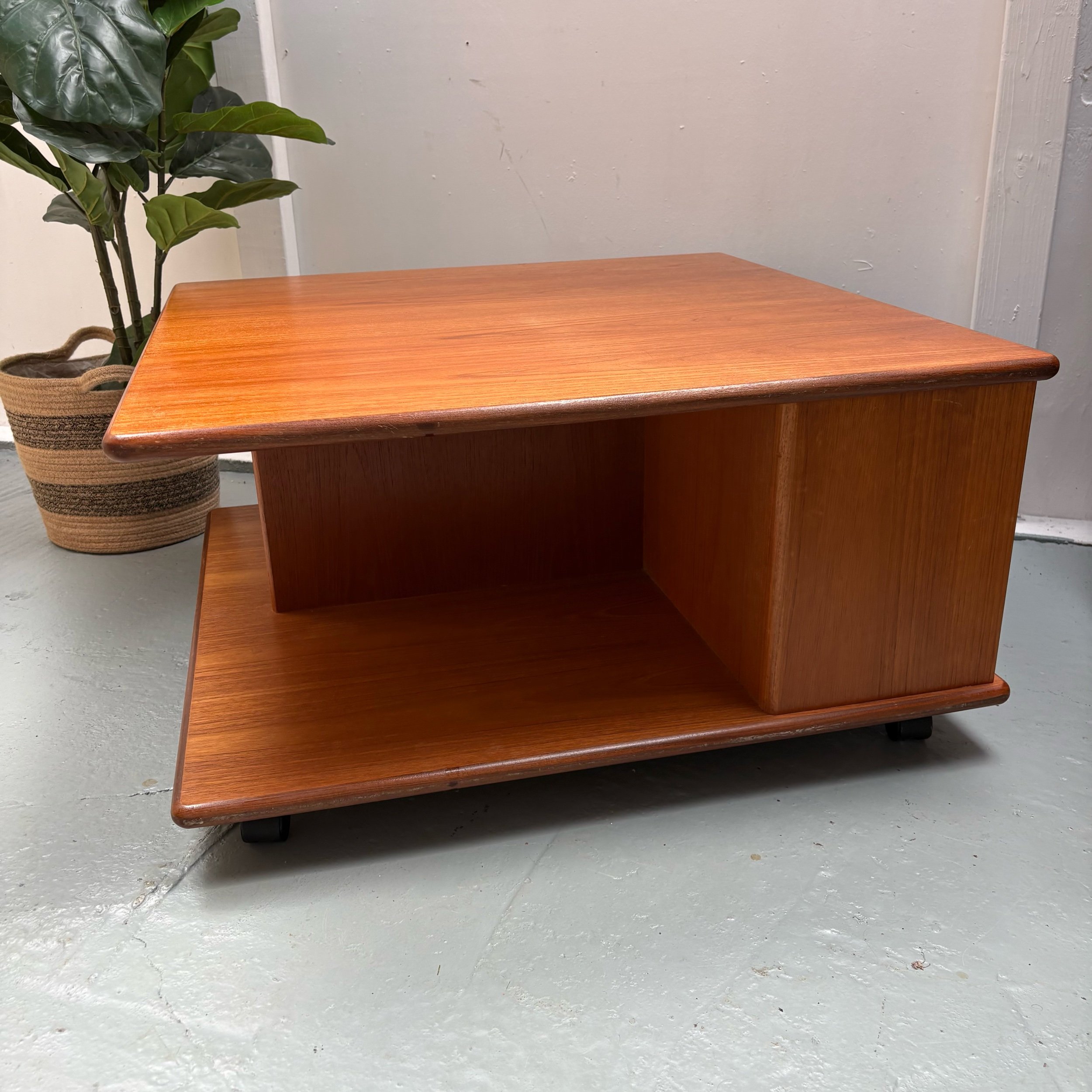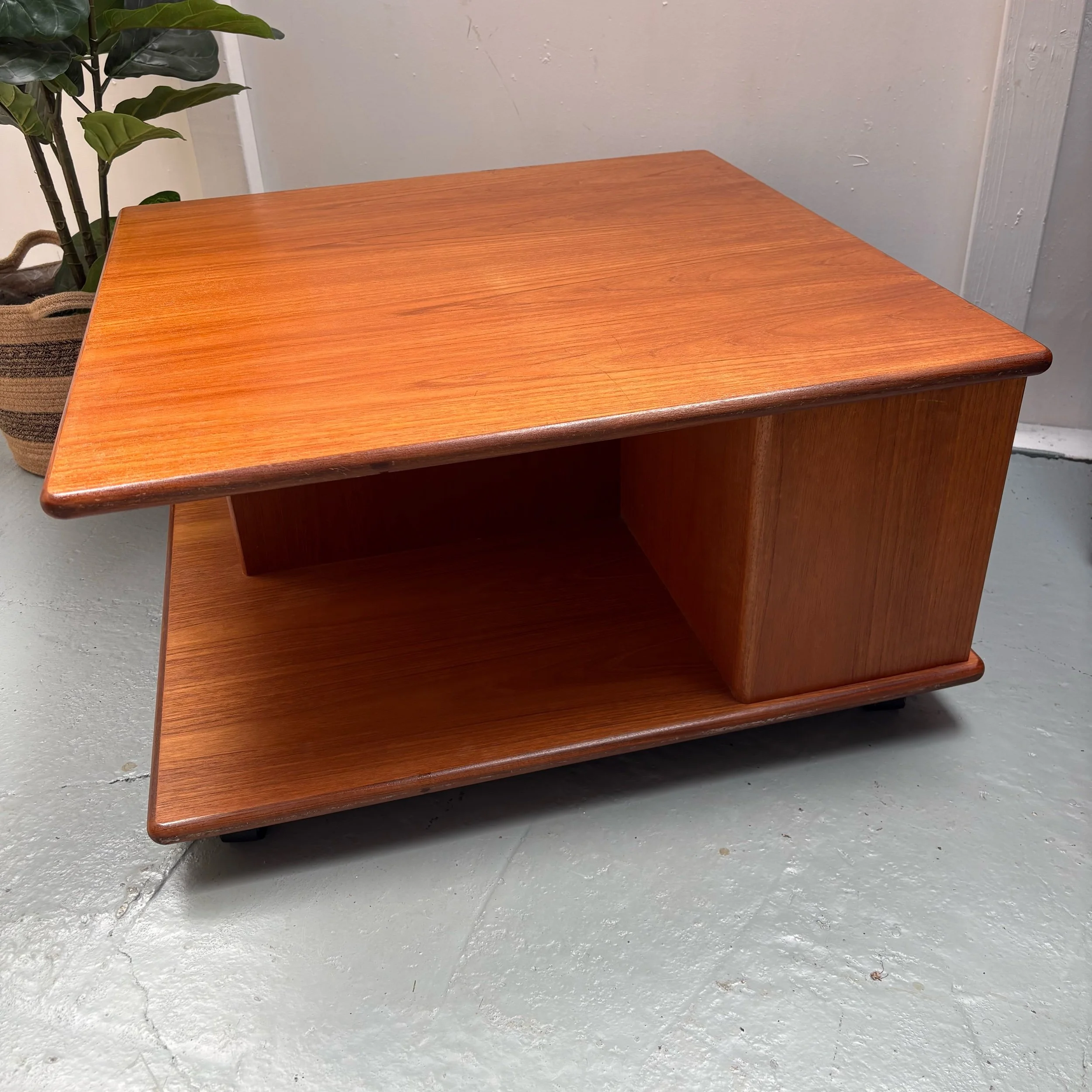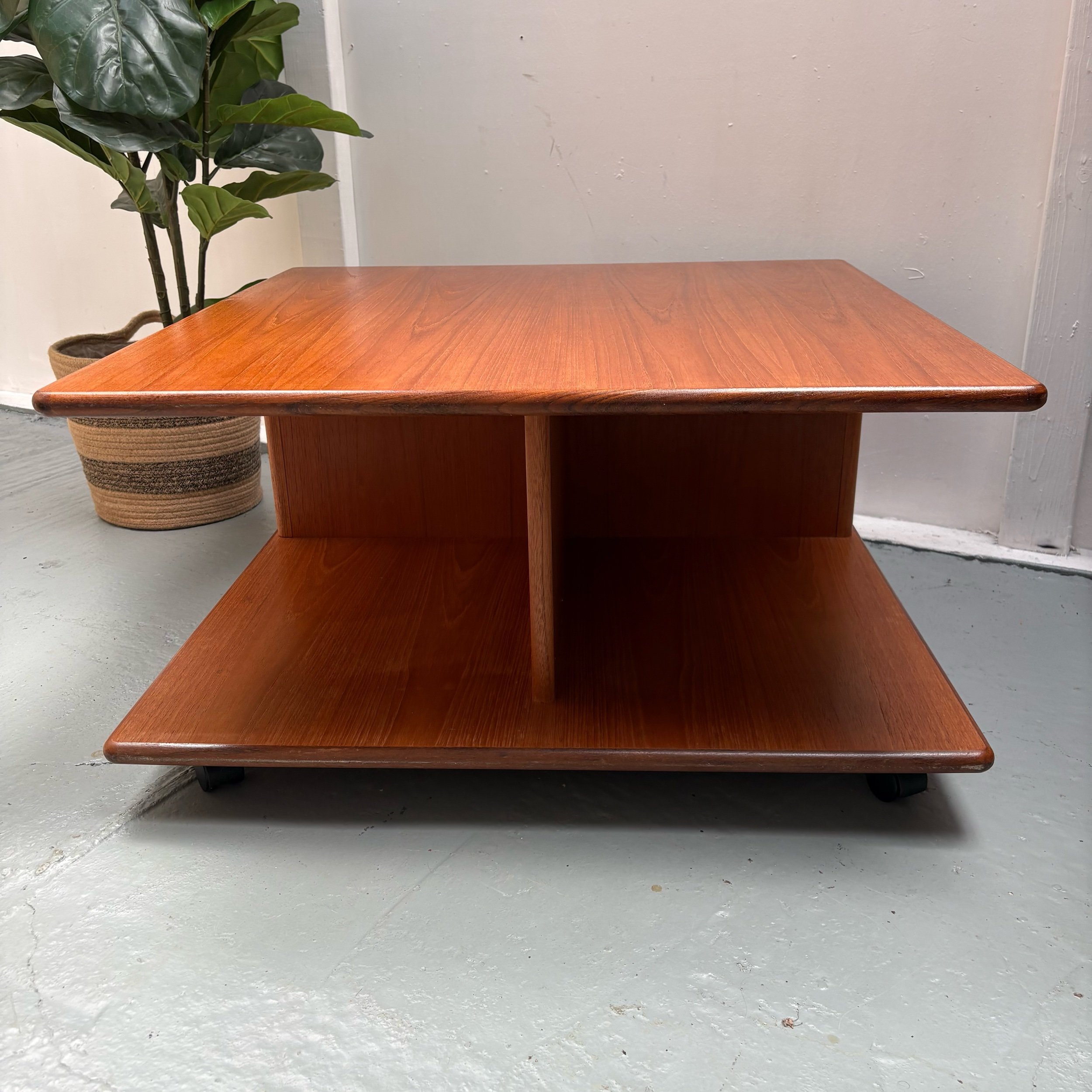 This rare G Plan square centre piece coffee table in retro Pandora style is made of teak with a medium wood tone.