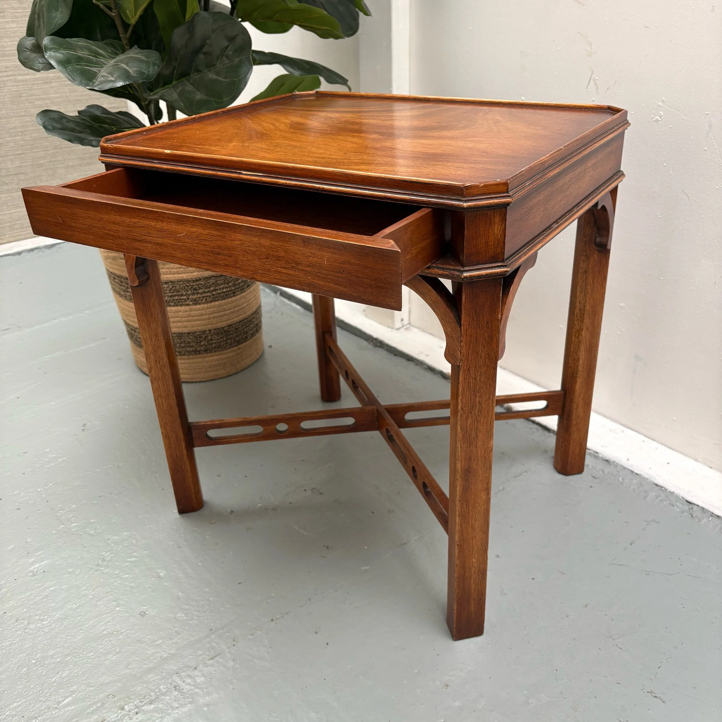 With a tabletop made of mahogany, with a galleried edge, and a single concealed drawer for storage, this fully assembled side table is perfect for indoor use in a living room or lounge.