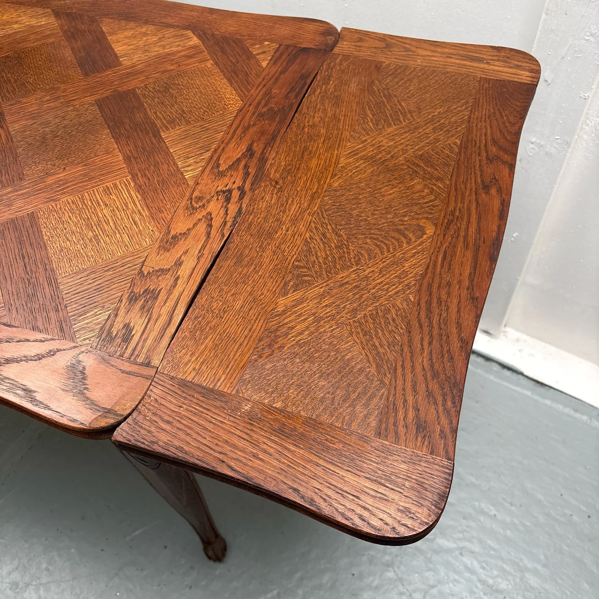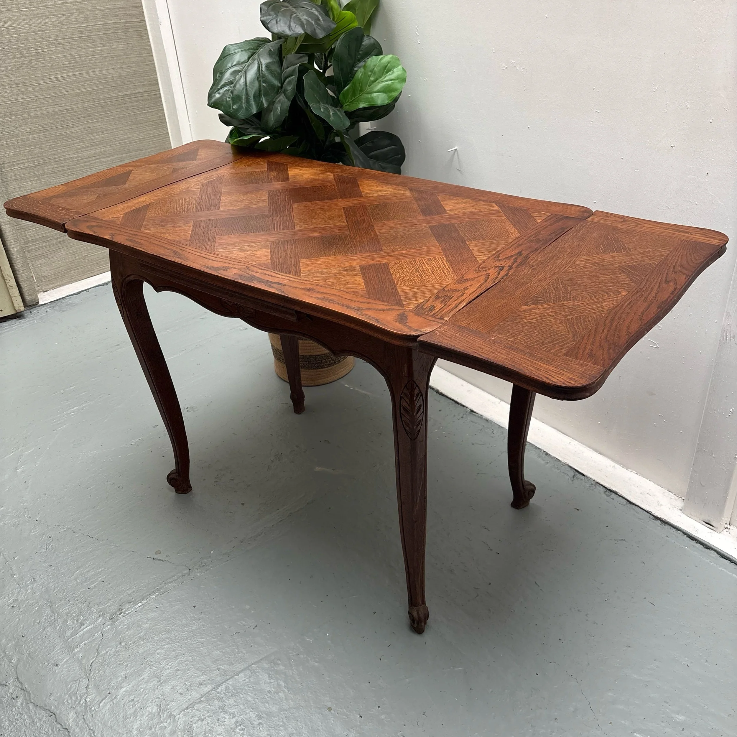 This Vintage French Country Provincial Parquetry Extending Console Table is a charming piece of antique furniture, perfect for adding a touch of classic elegance to any room.