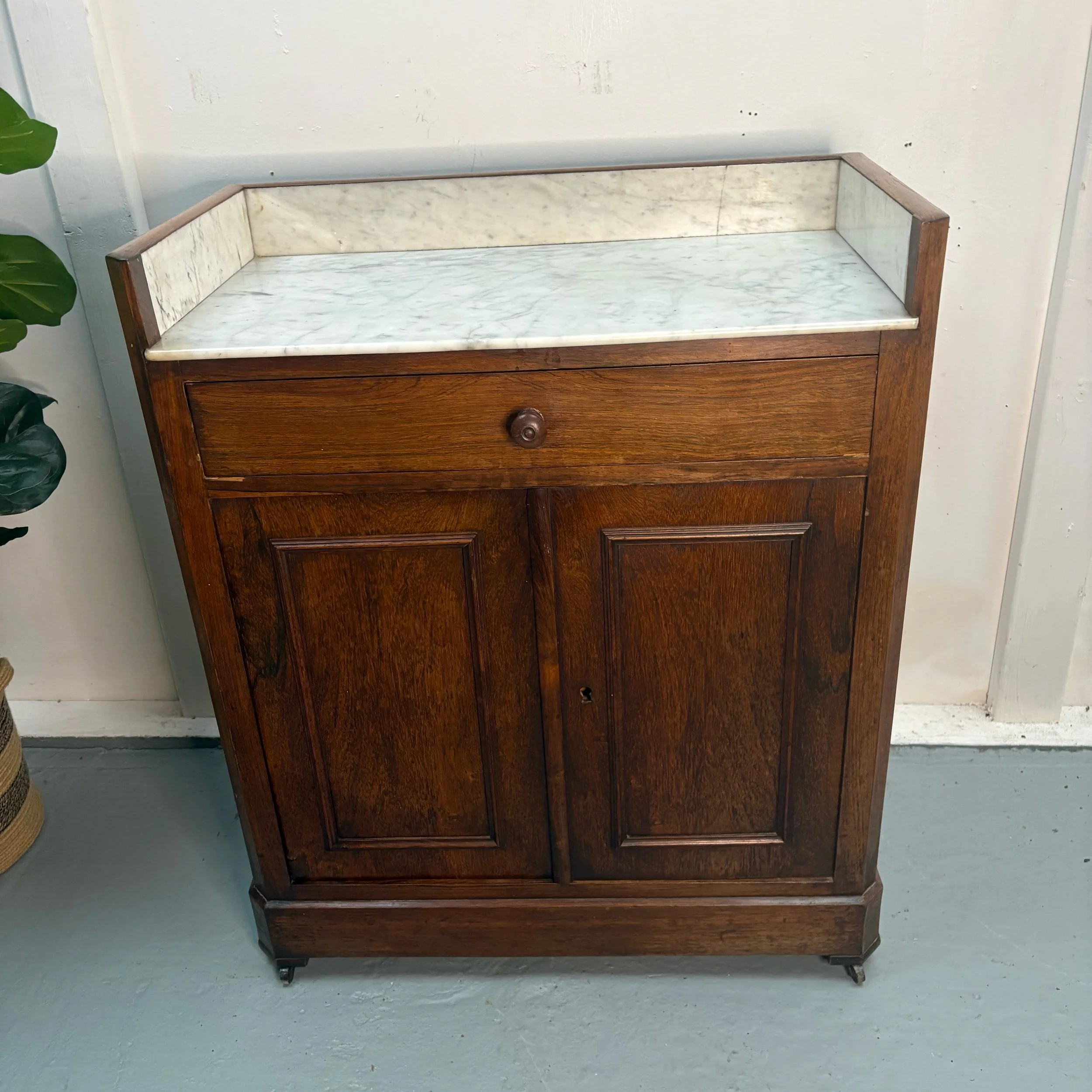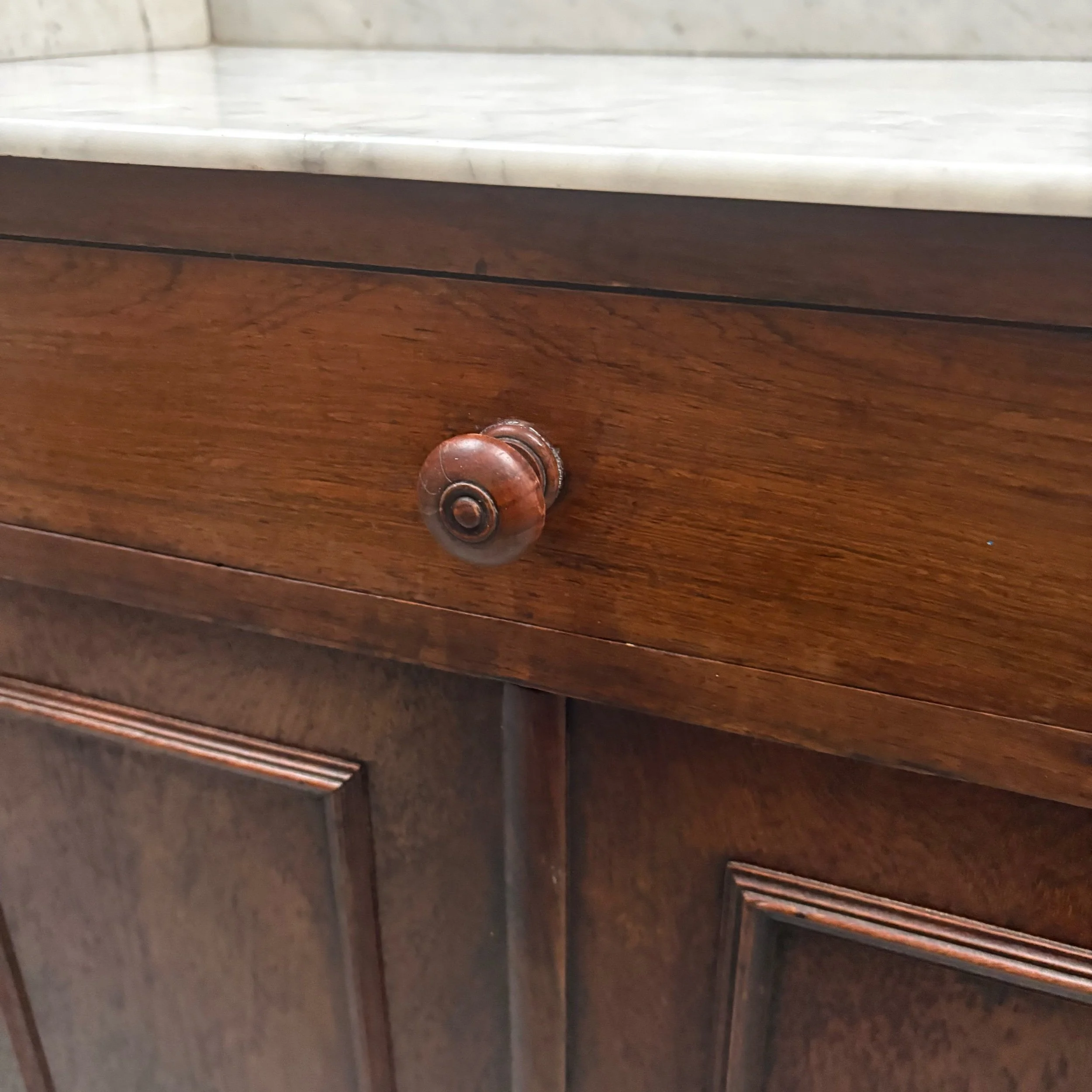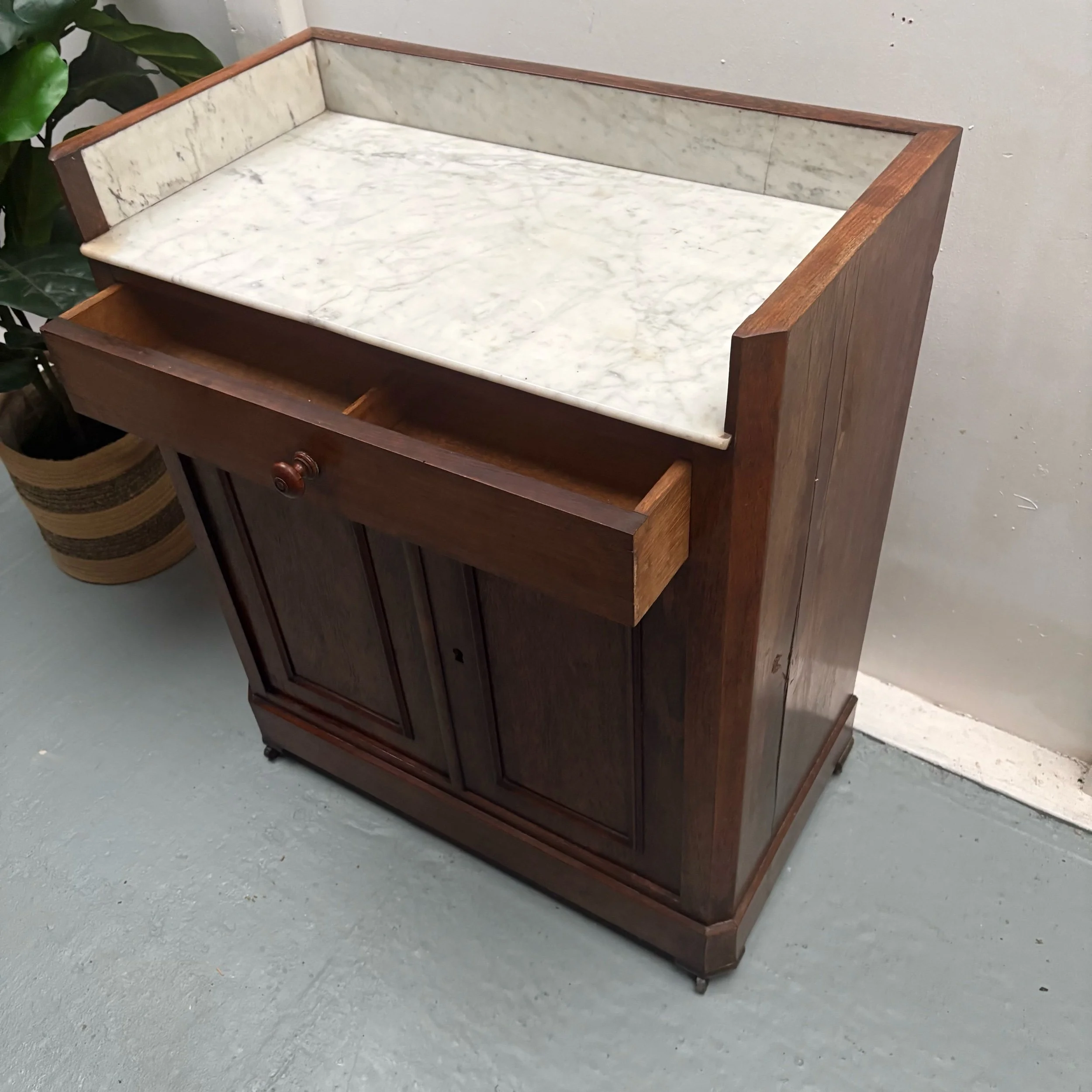 This early twentieth century French mahogany vanity washstand “table de toilette” features a white inset marble top and upstand, featuring prominent grey veining..