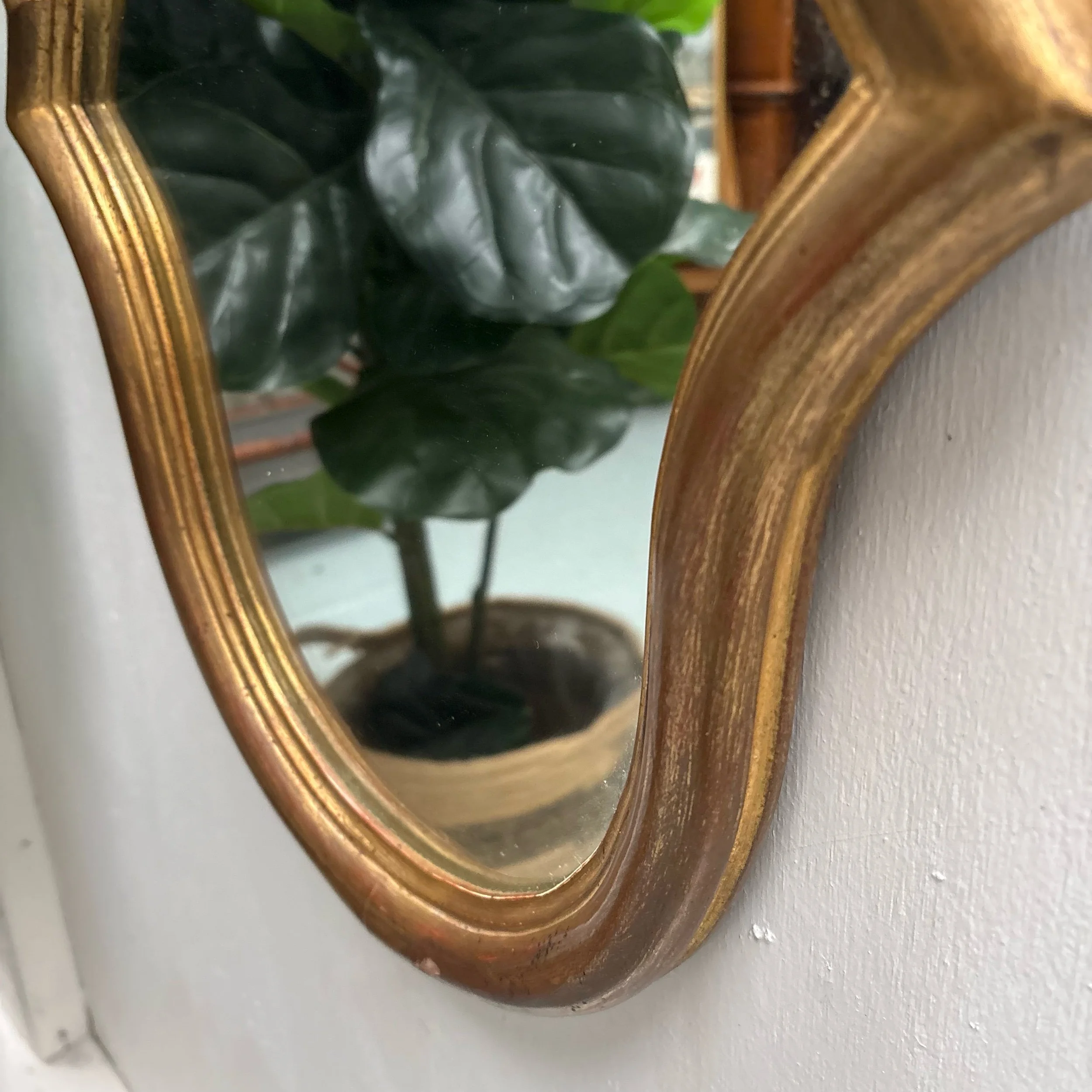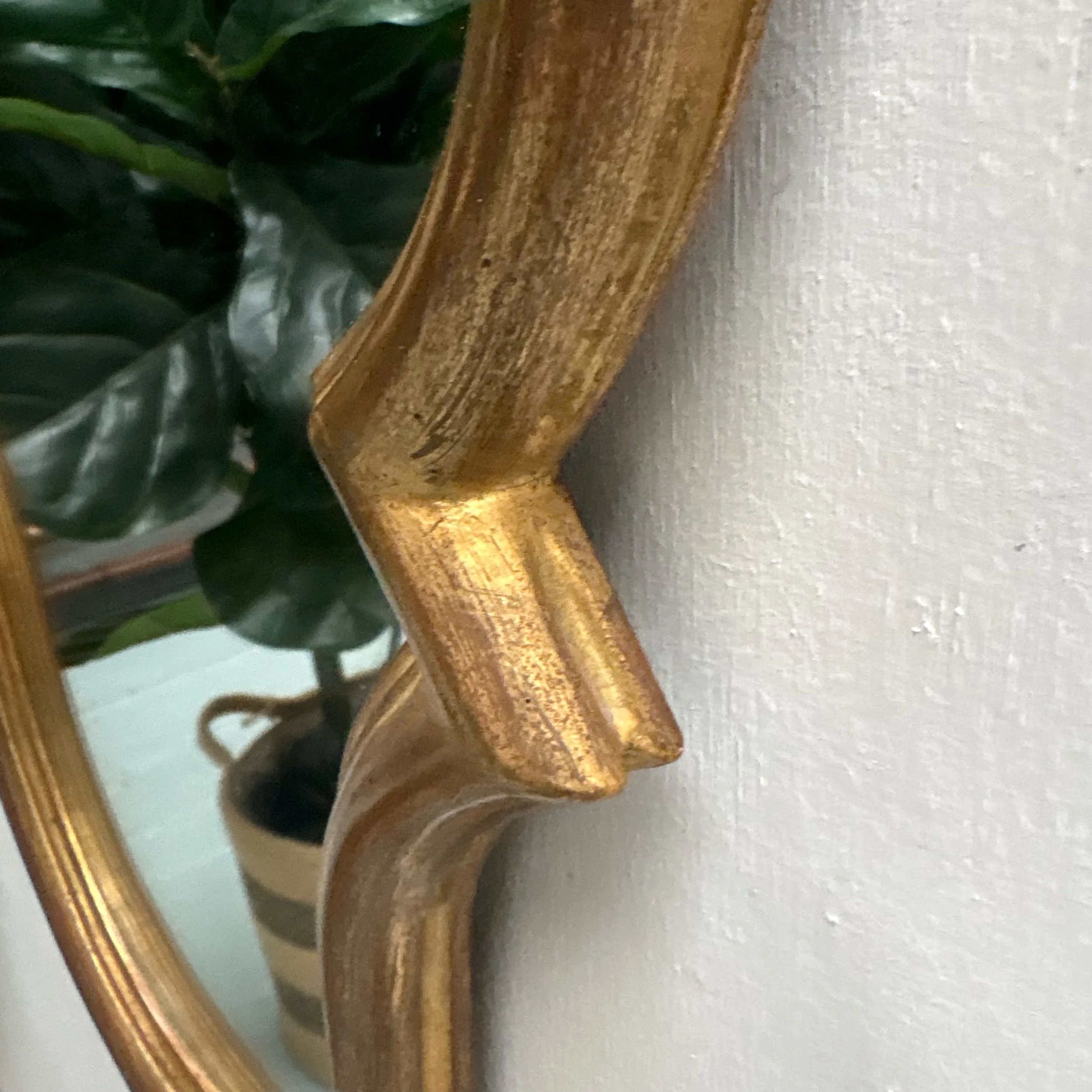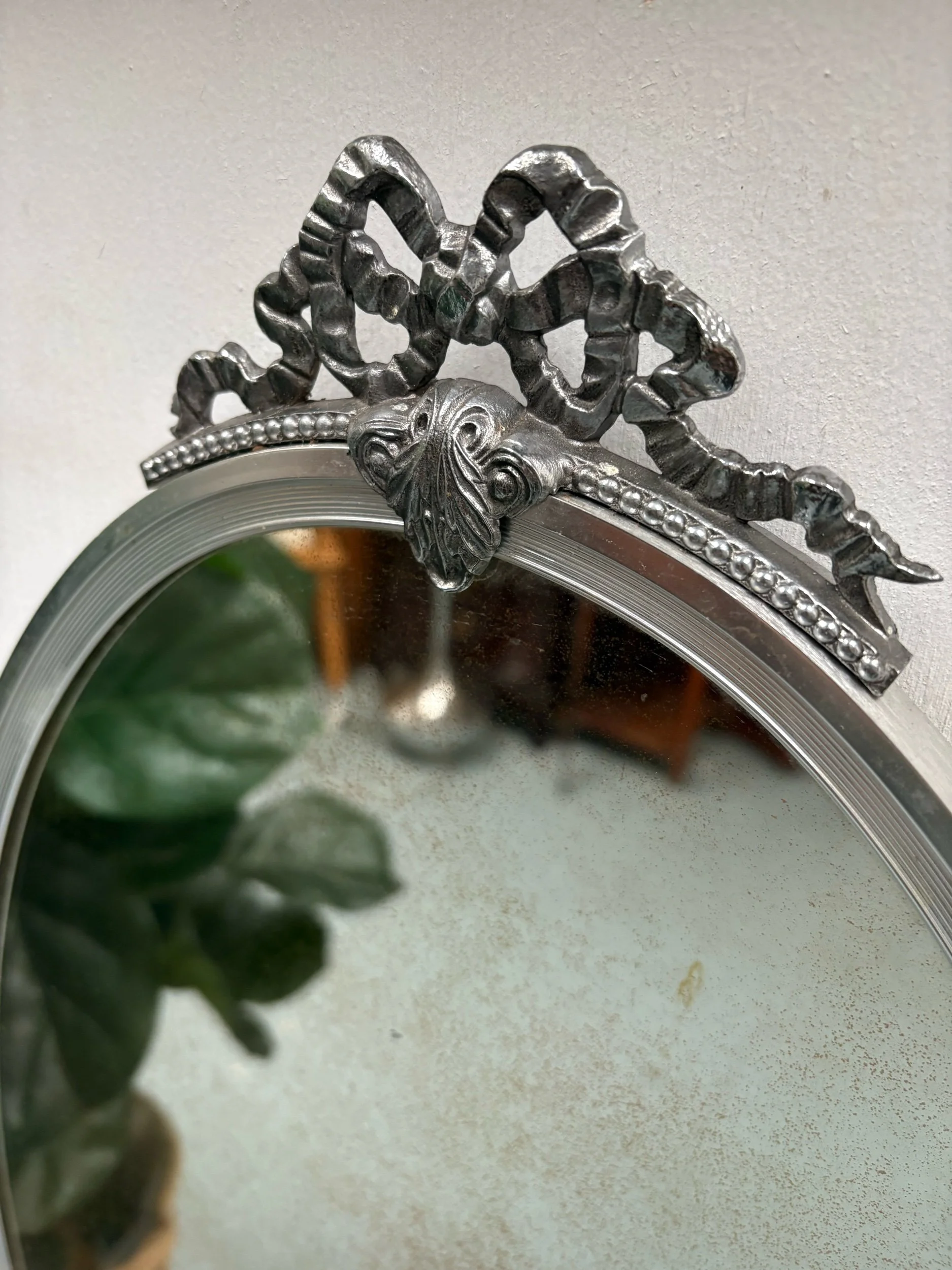 The mirror features an oval shaped lightly foxed surface, giving it a vintage charm.