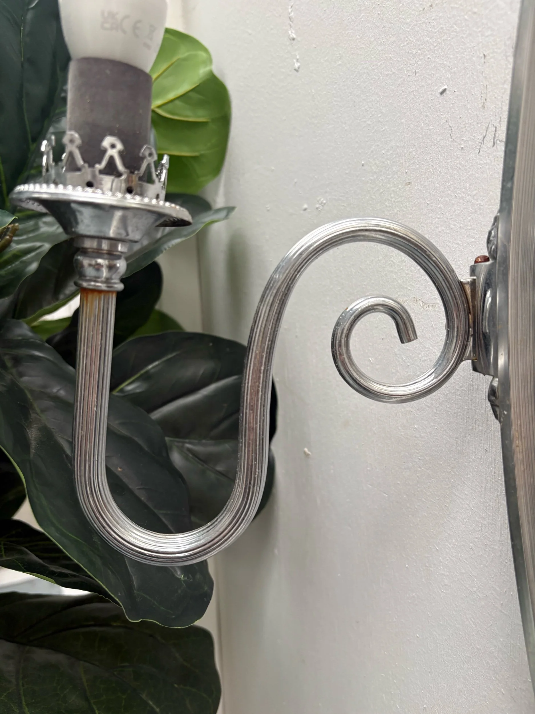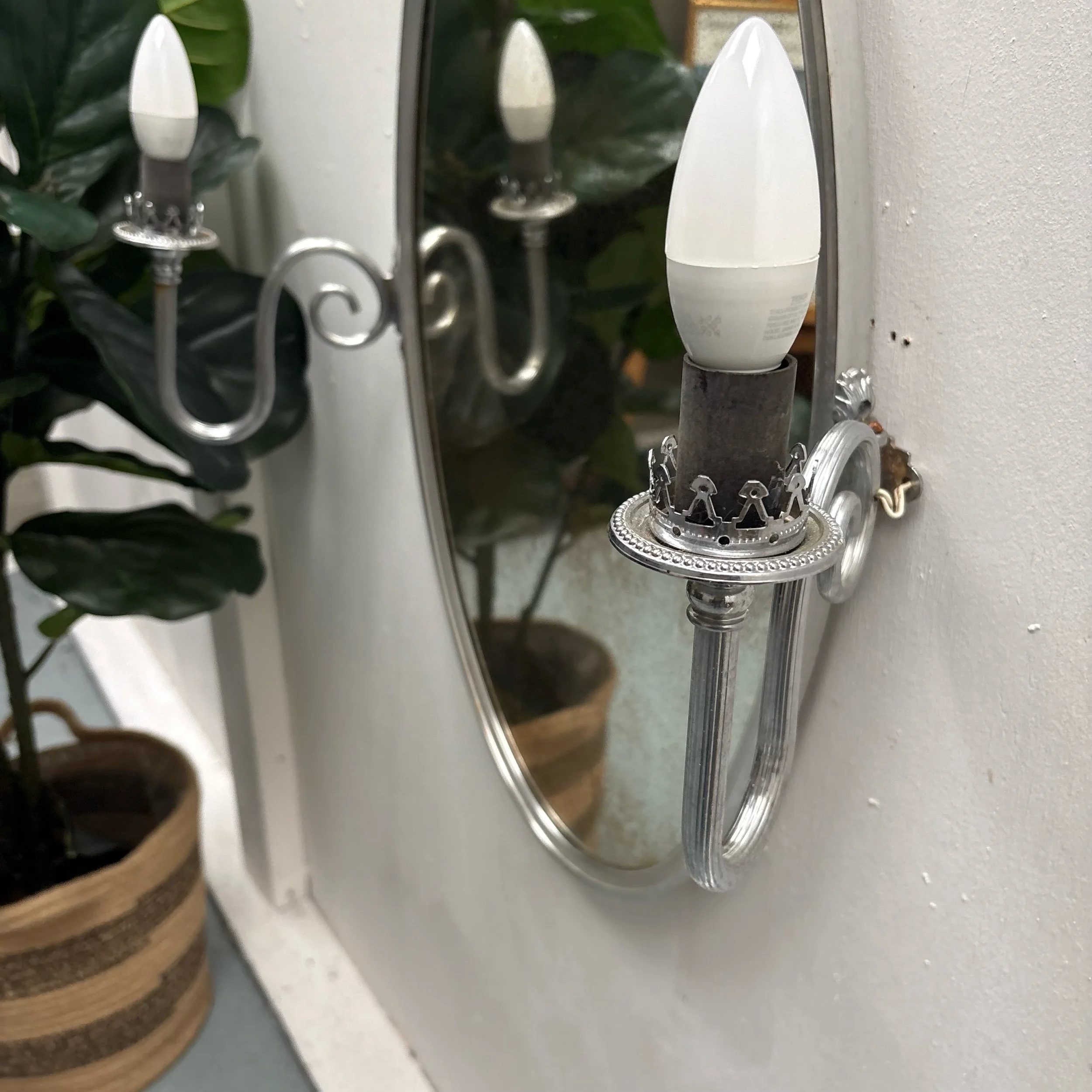 Rare 1960s European Silver Oval Wall Lightly Foxed Mirror With Two Side Sconces