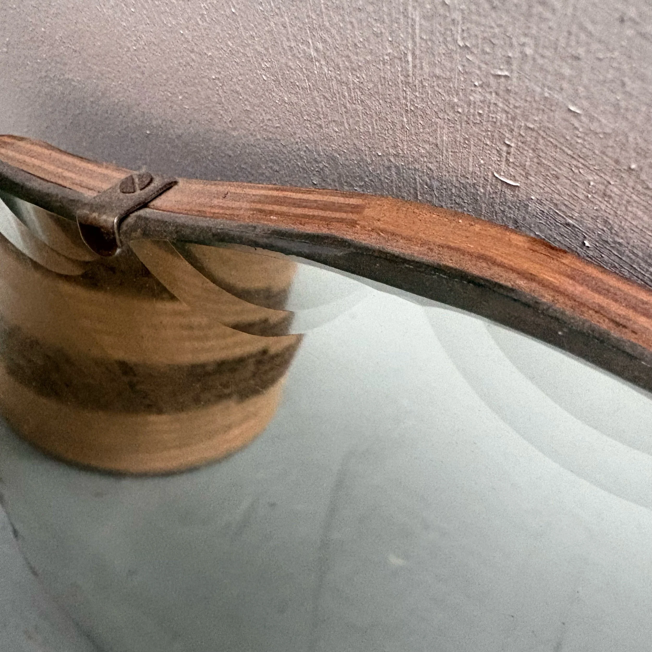 This Art Deco Shield Mirror with a Bevelled Scalloped Edge and Decorative Clips from around 1930 exudes elegance and vintage charm.
