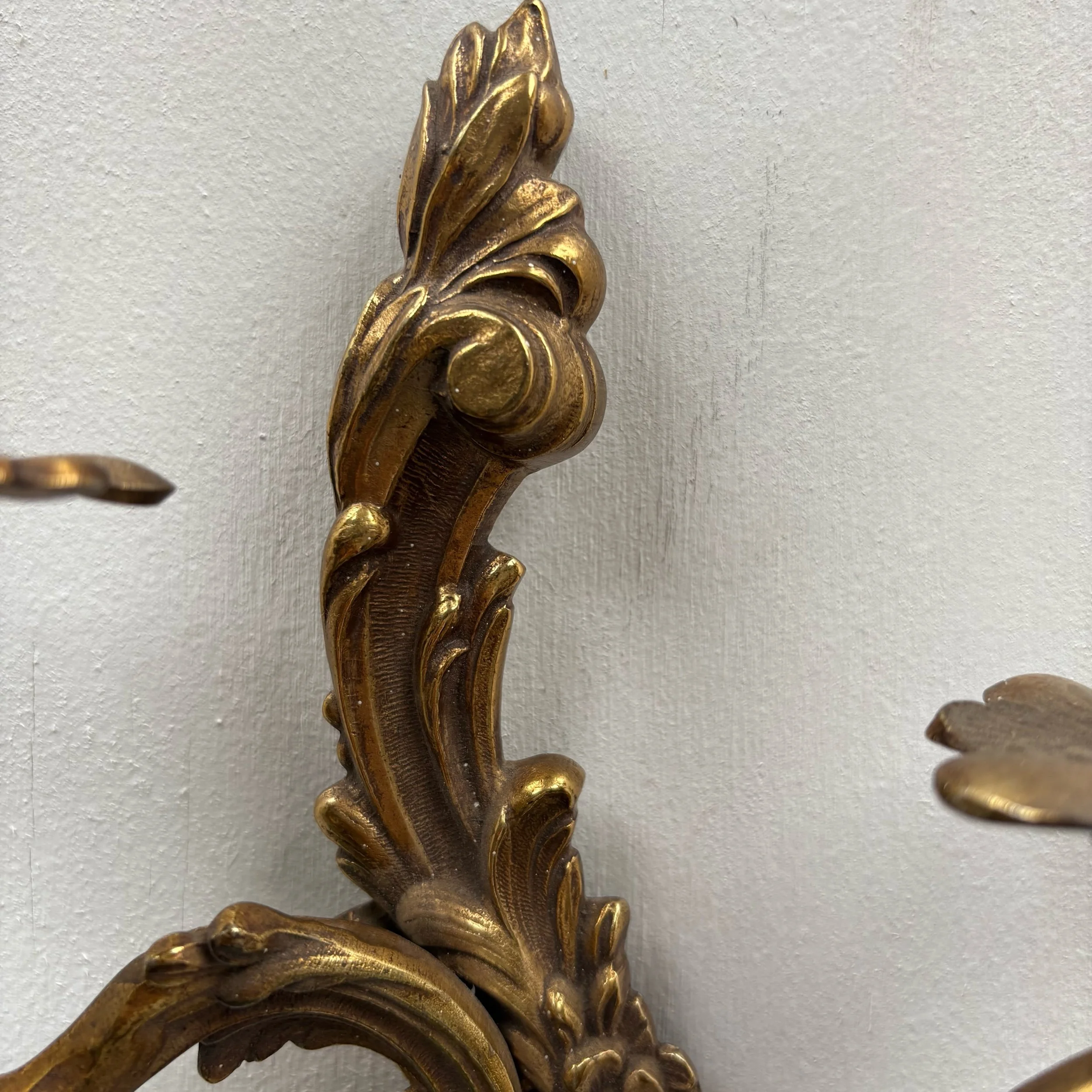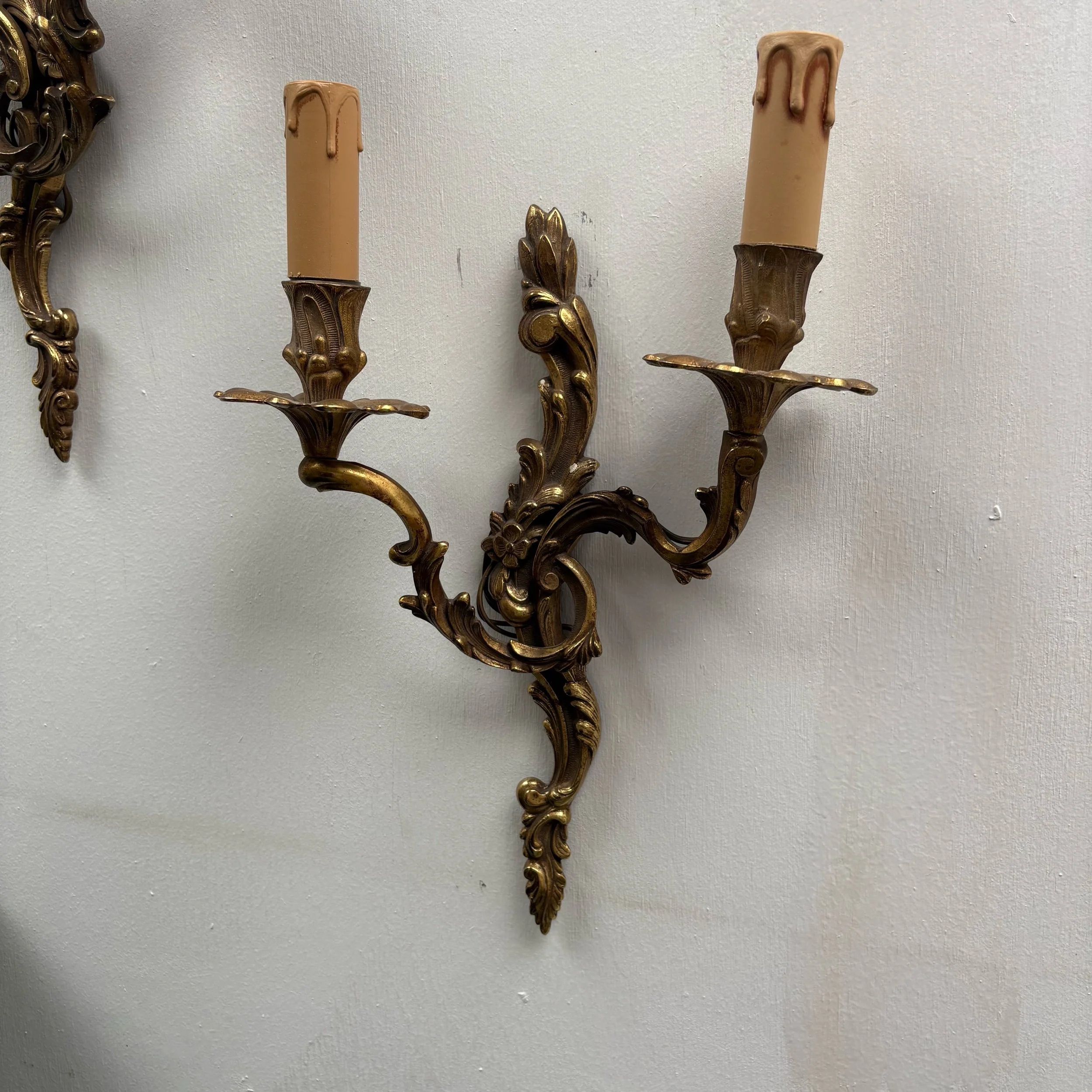 Old pair of French bronze double-light wall sconces, acanthus leaf design from the 1950s