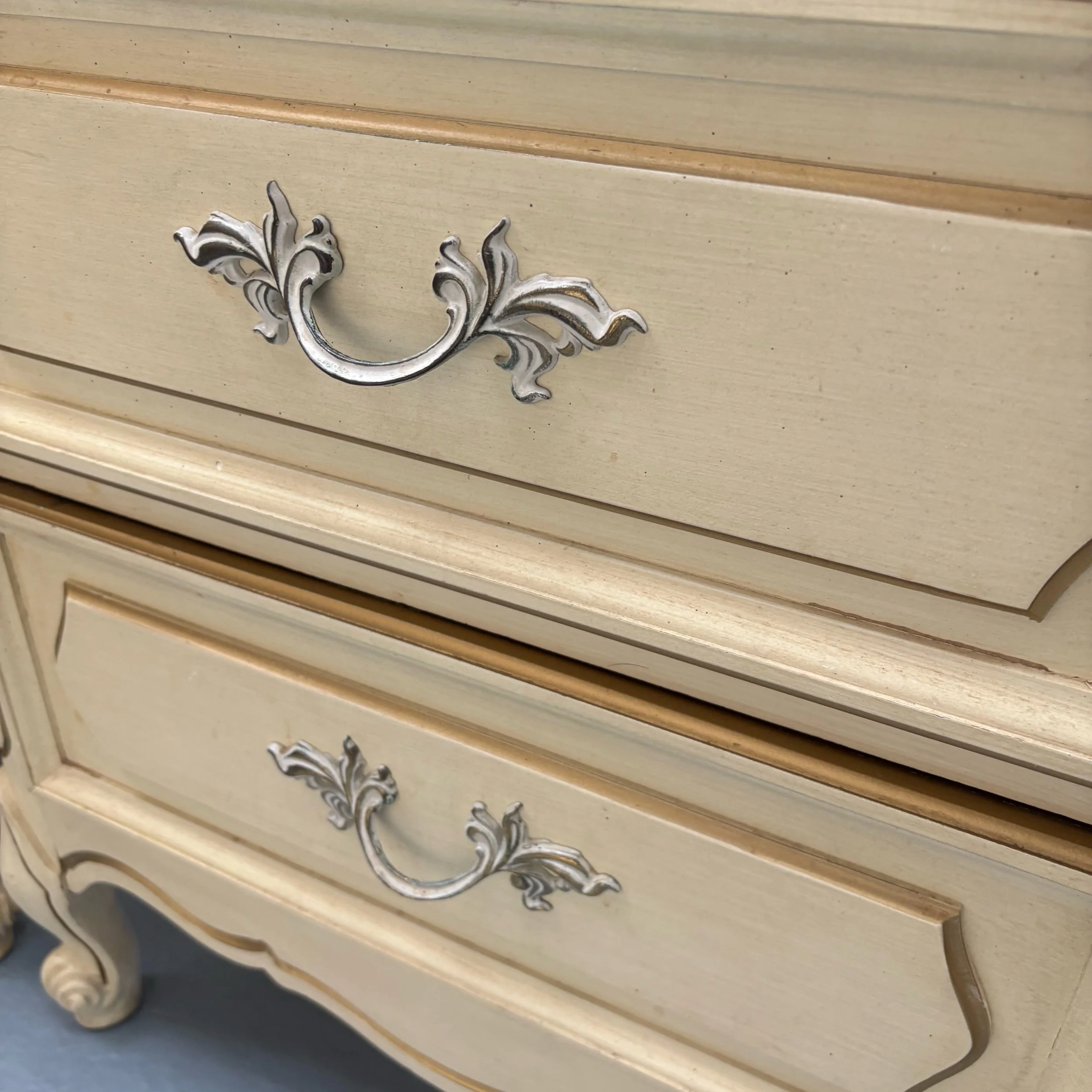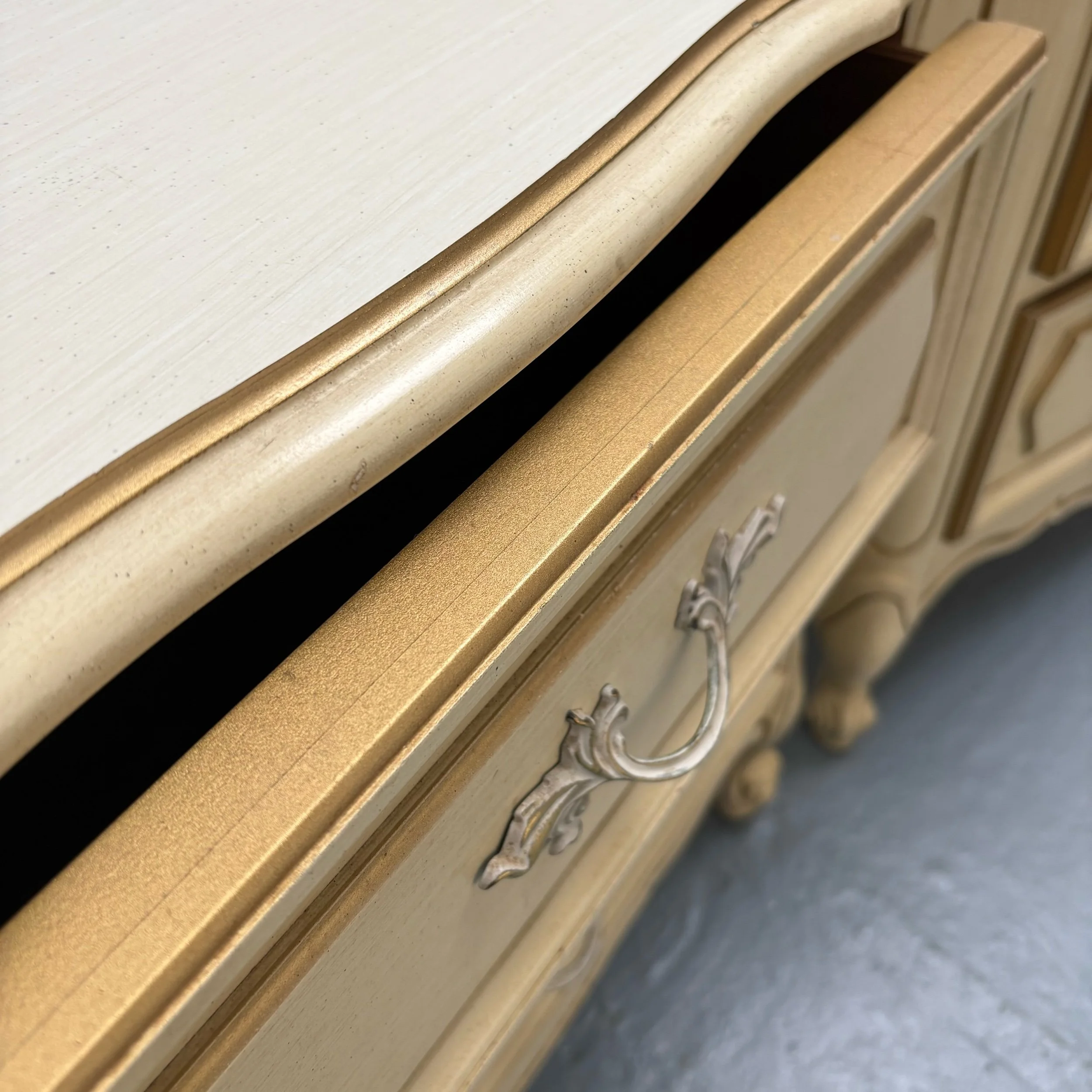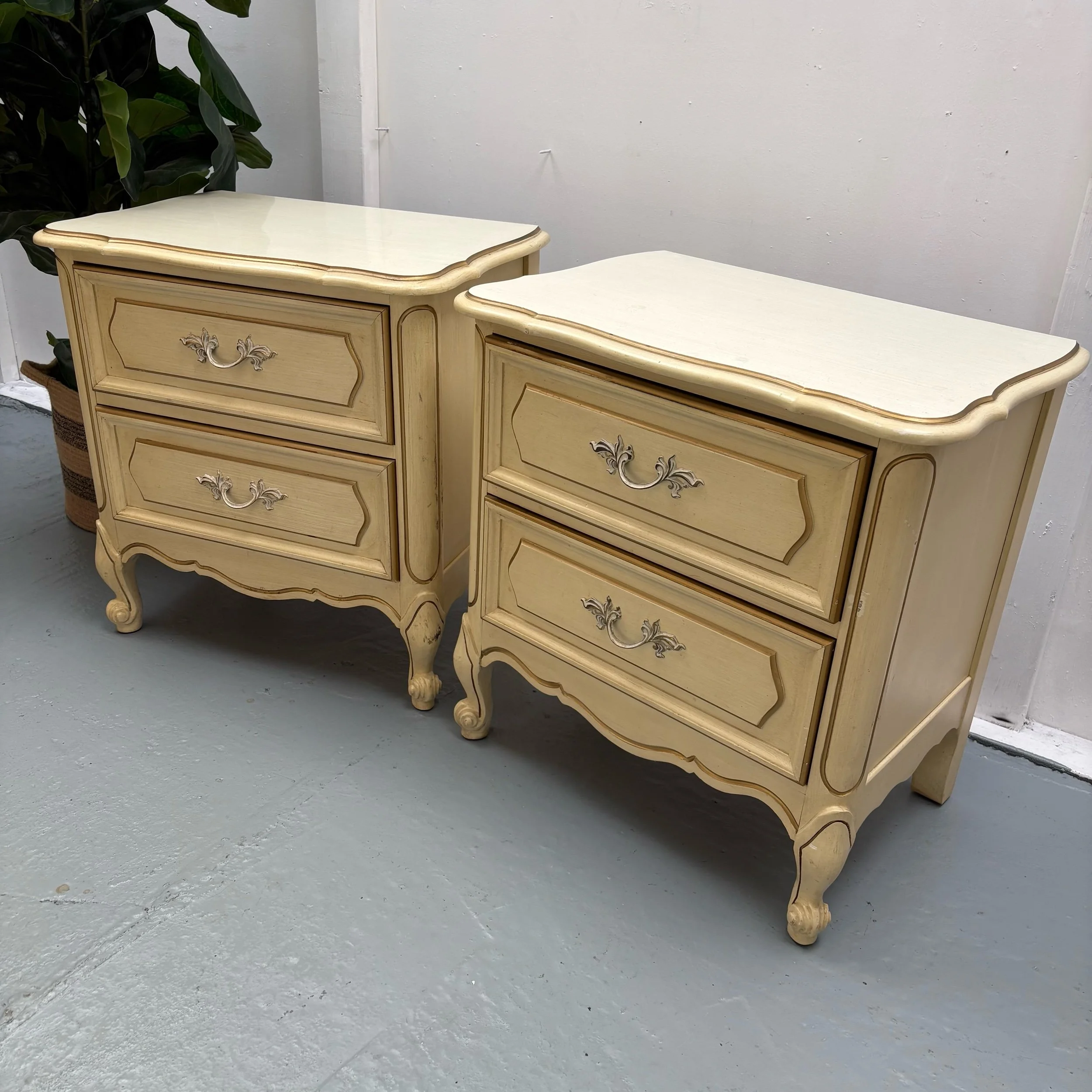 Pretty French Provincial style nightstand pair with curved casing, nine dovetailed drawers, and elegant hardware that has detailing painted in stock gloss antique gold.