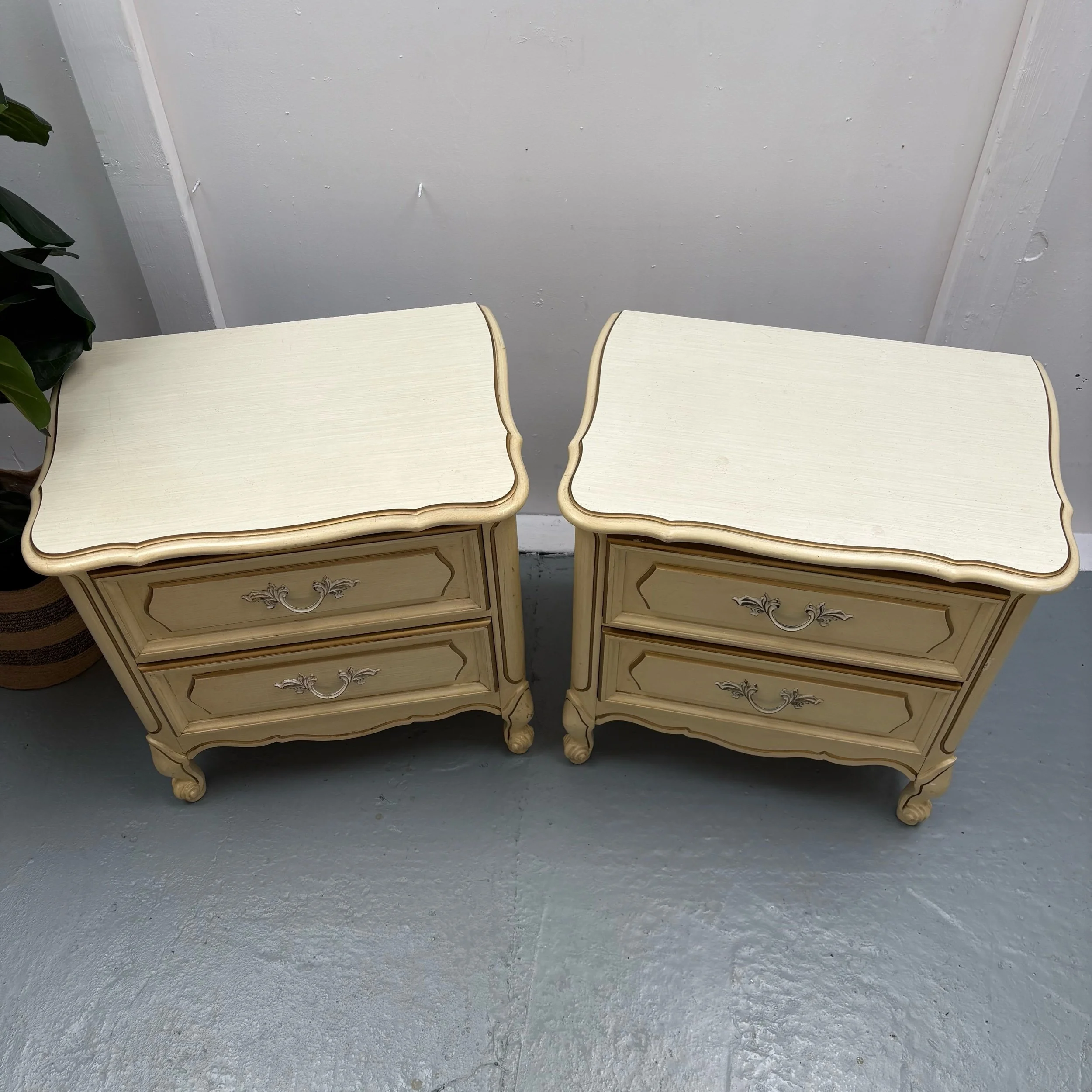 Vintage Pair of Henry Link French Provincial Style Cream Painted Two Drawer Nightstands.