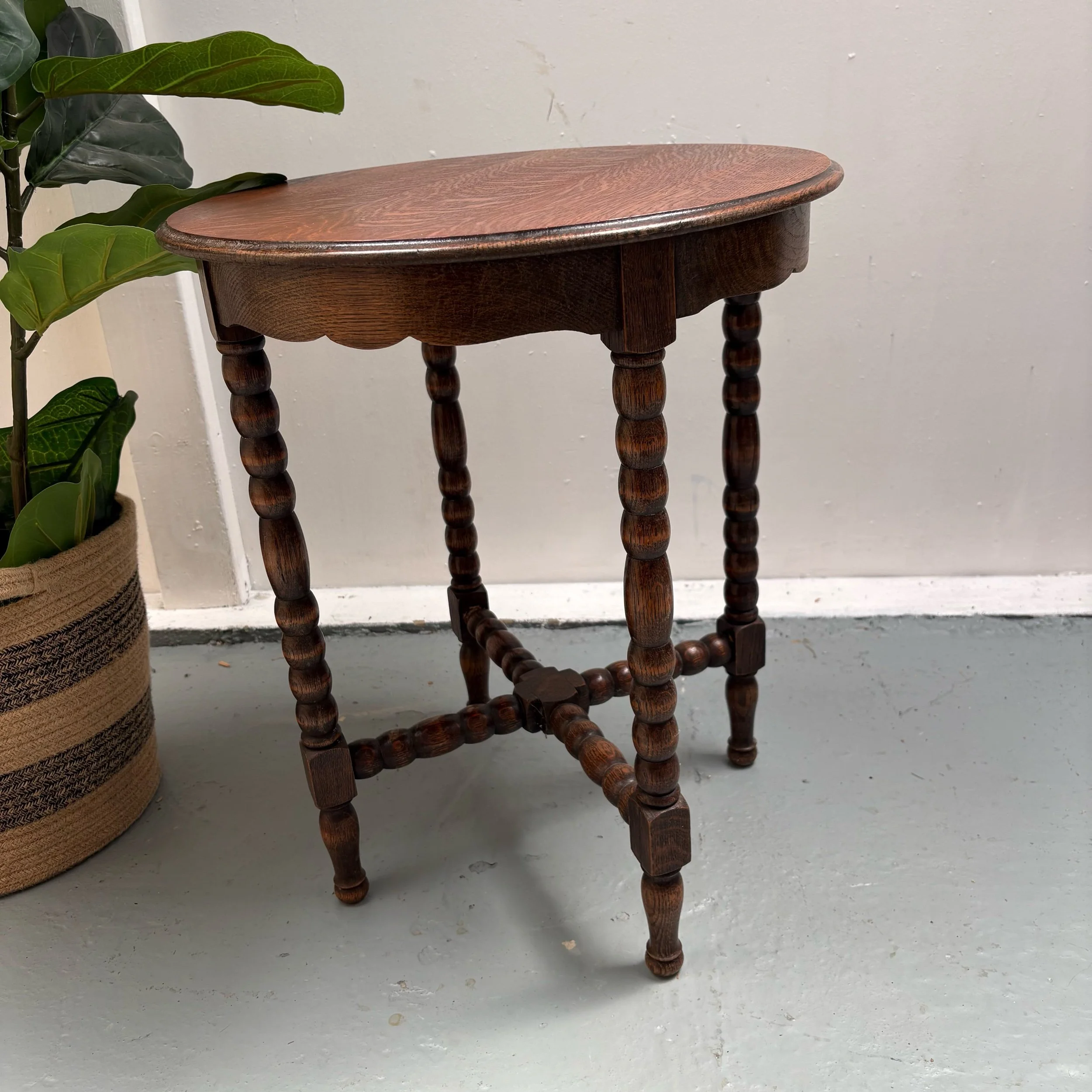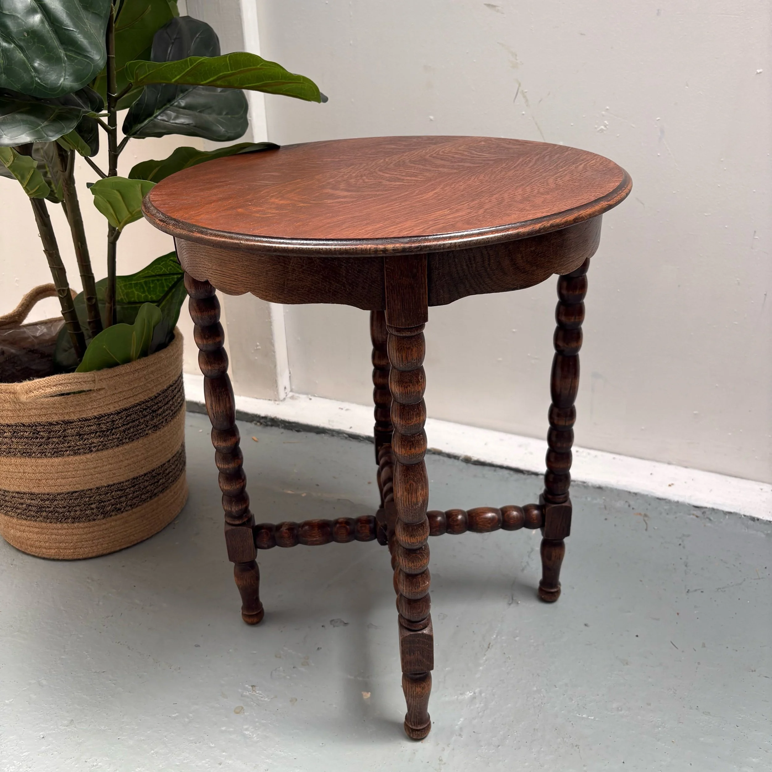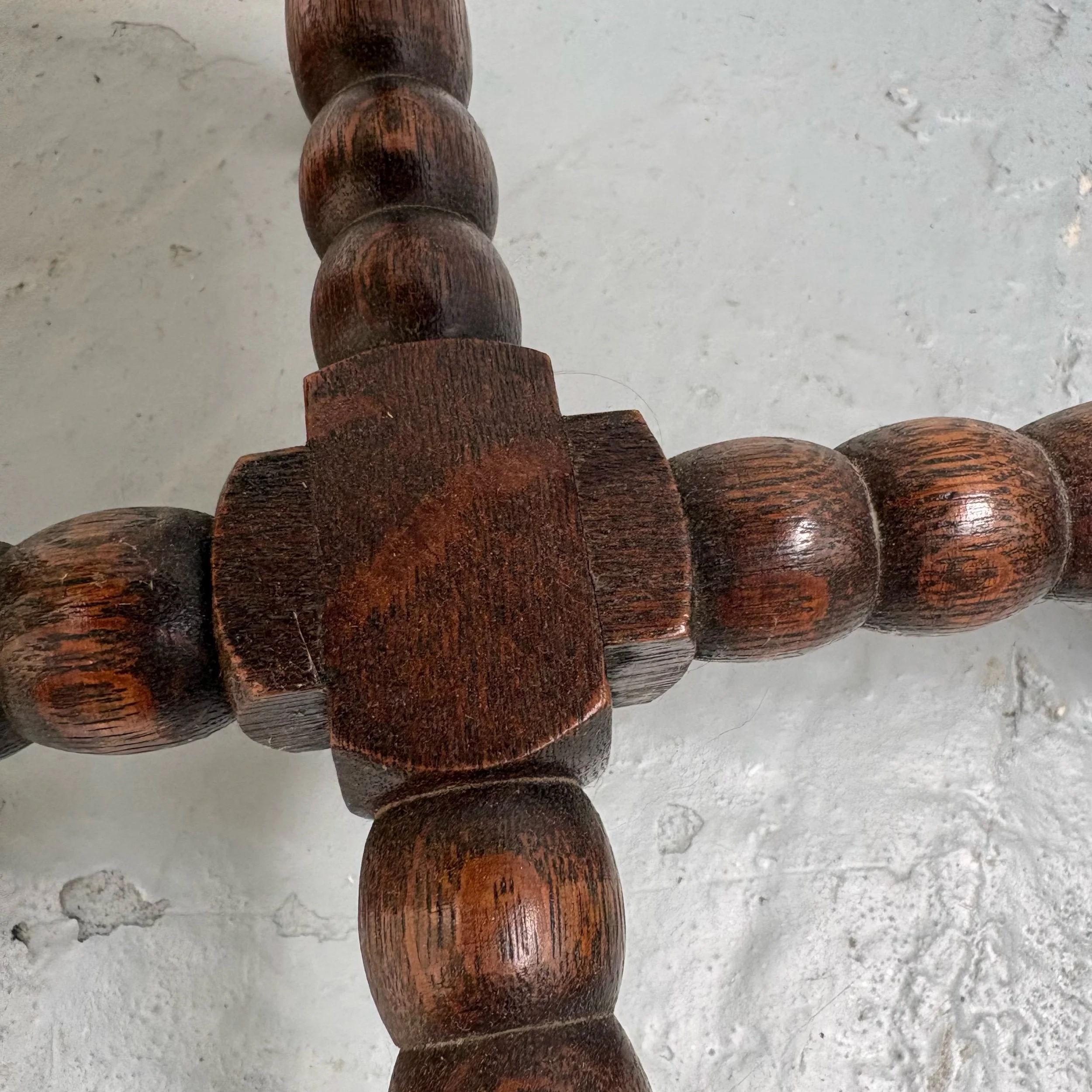 It features a planked oak top, supported by four carved bobbin legs linked at the base by a bobbin carved cross stretcher.