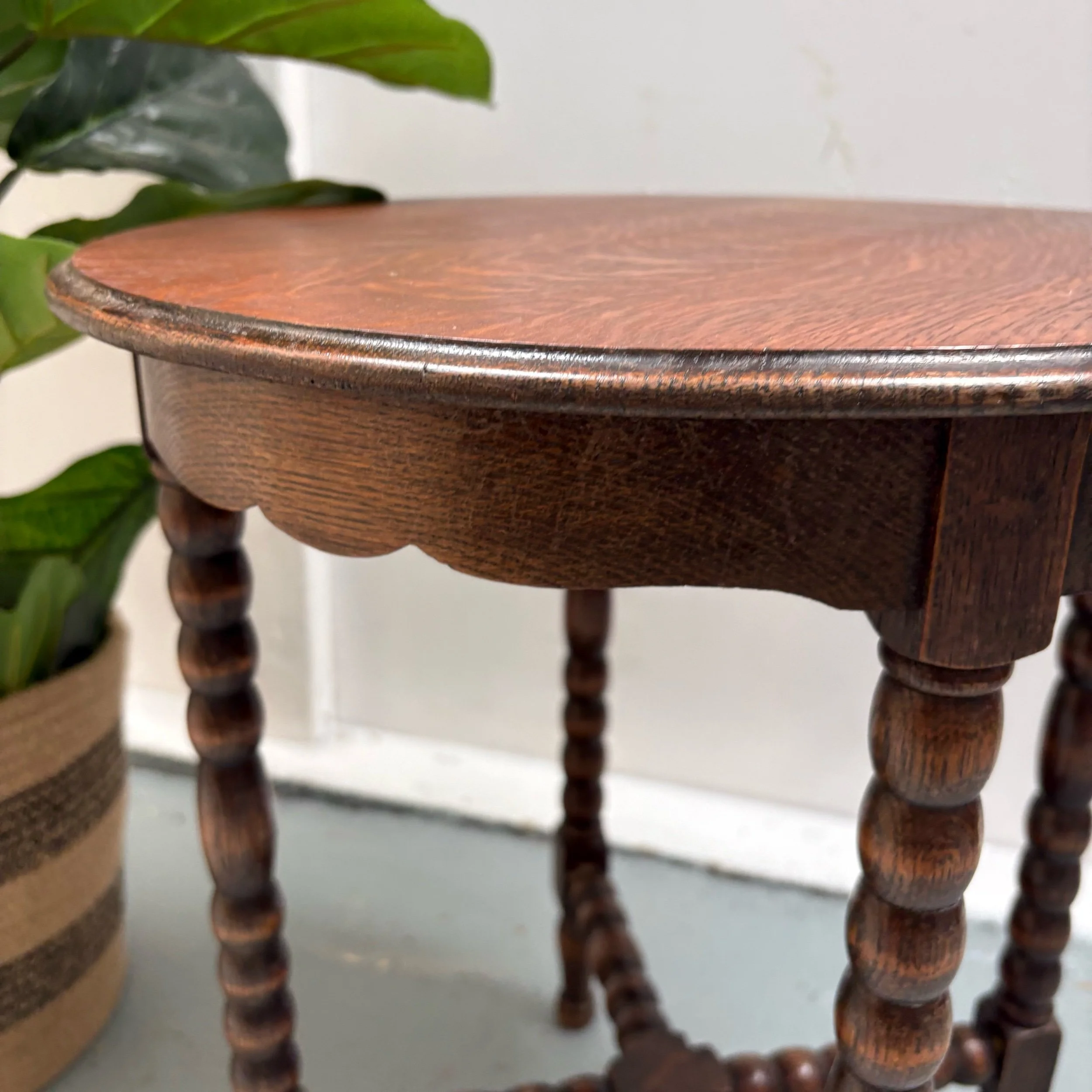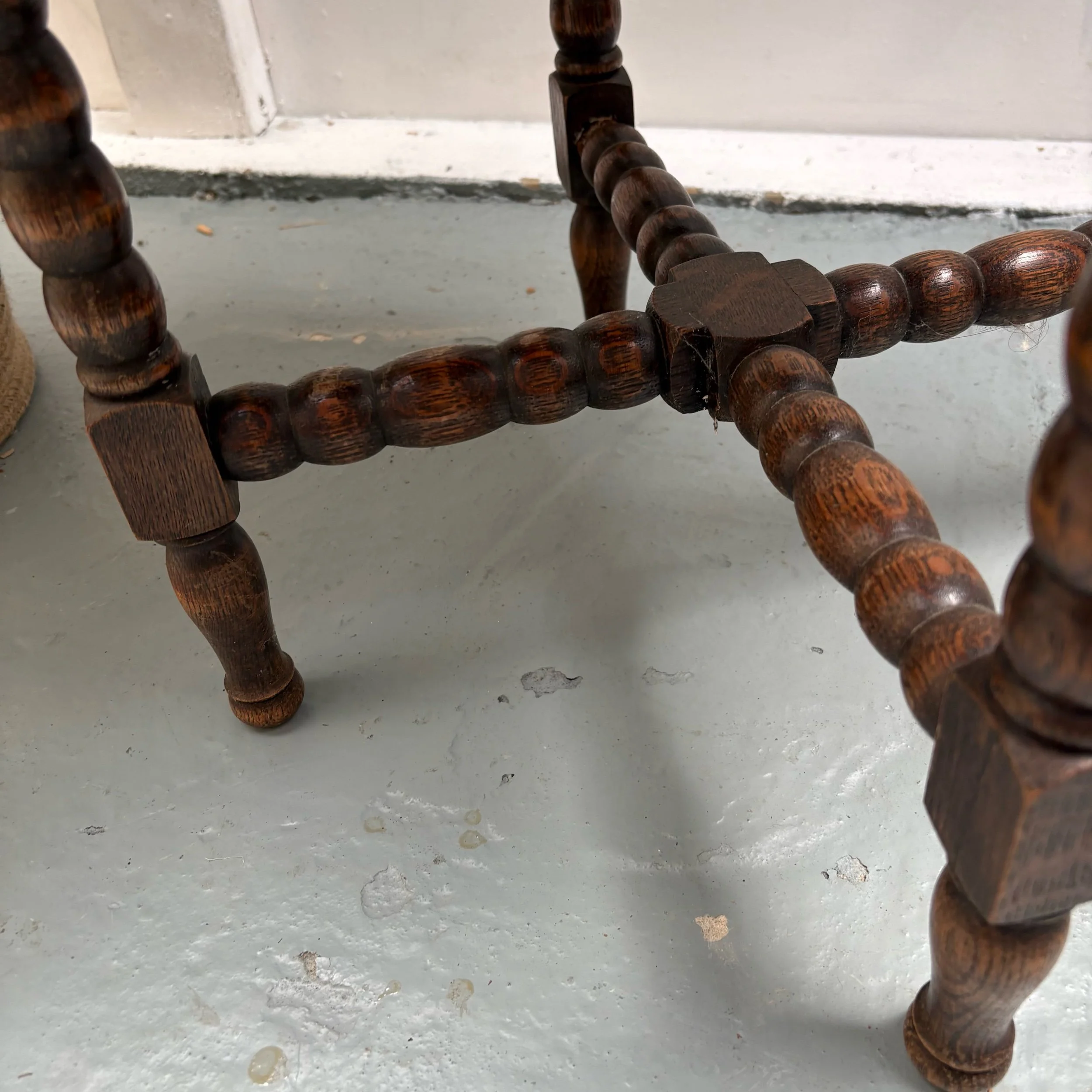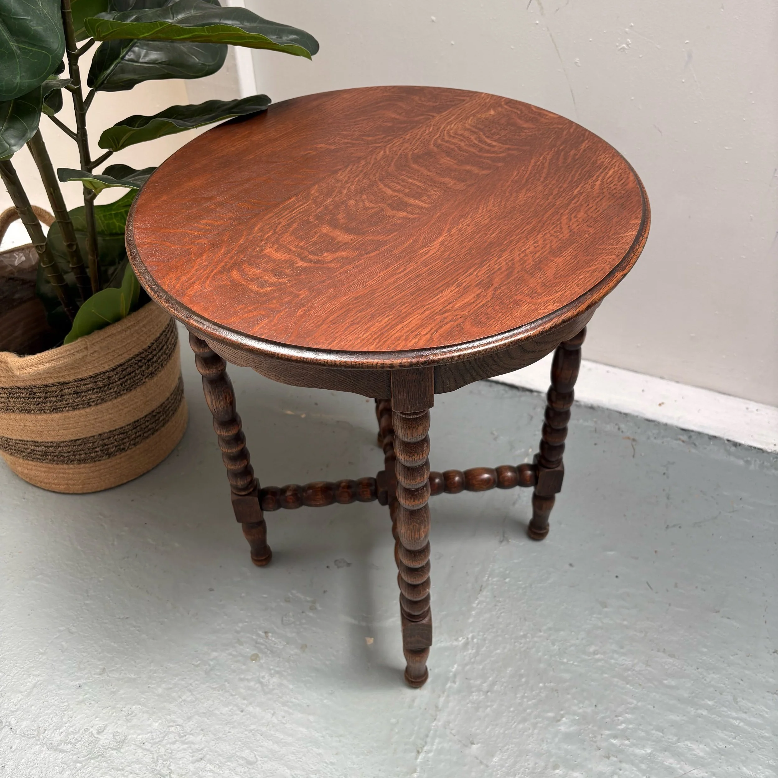 It features a planked oak top, supported by four carved bobbin legs linked at the base by a bobbin carved cross stretcher.