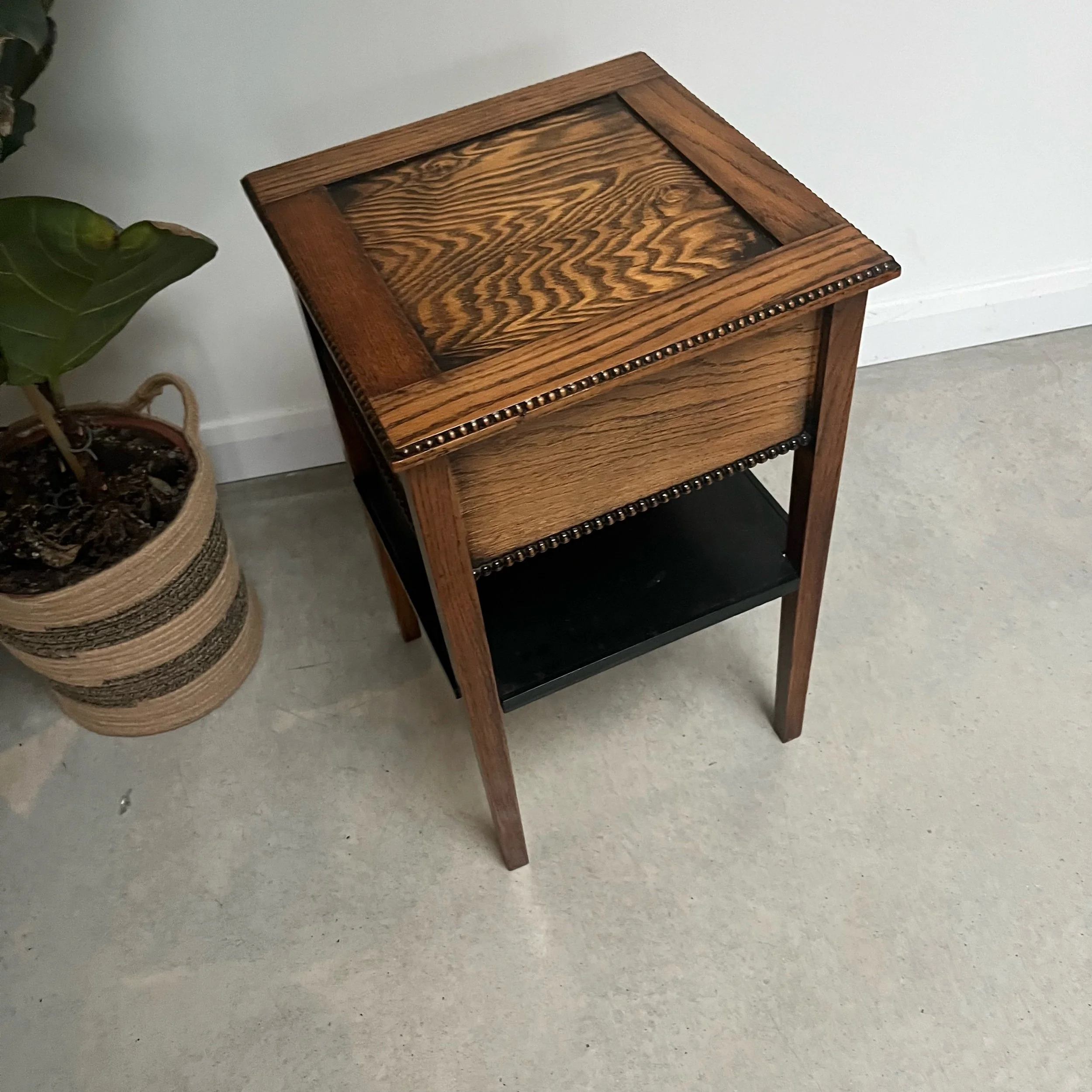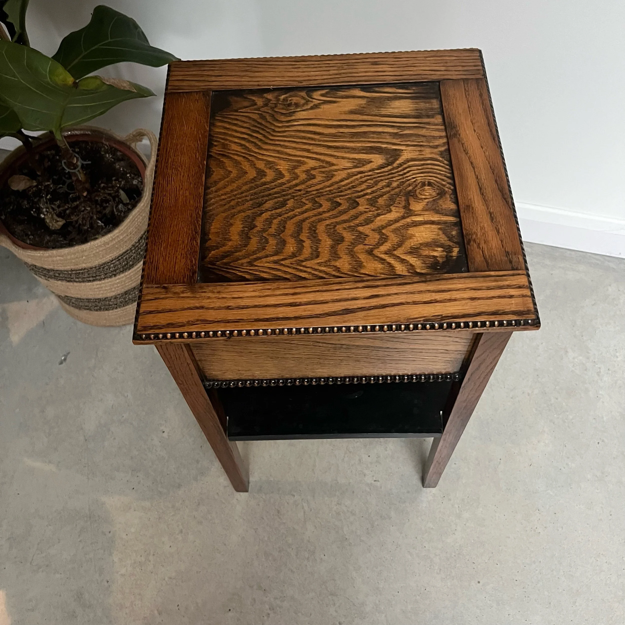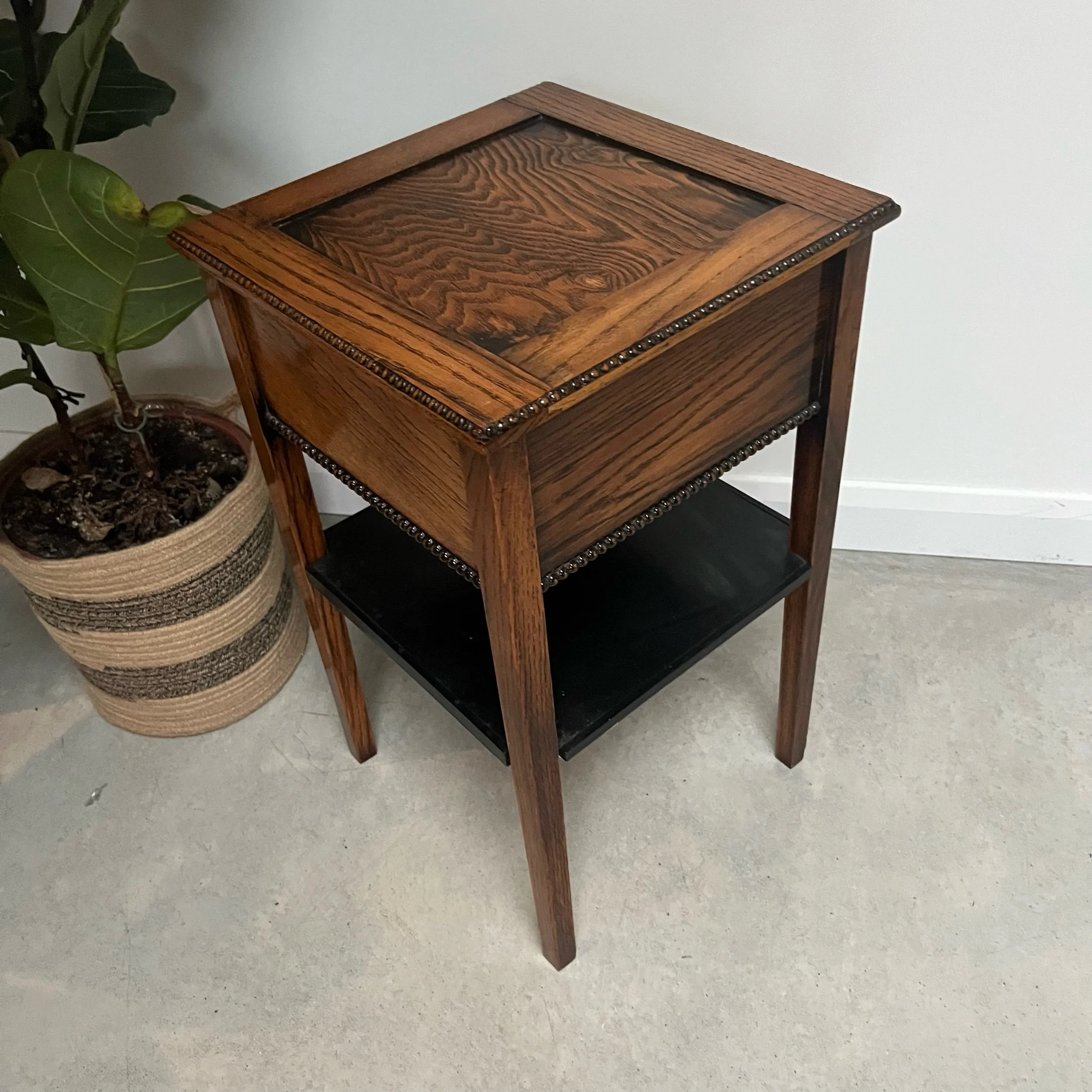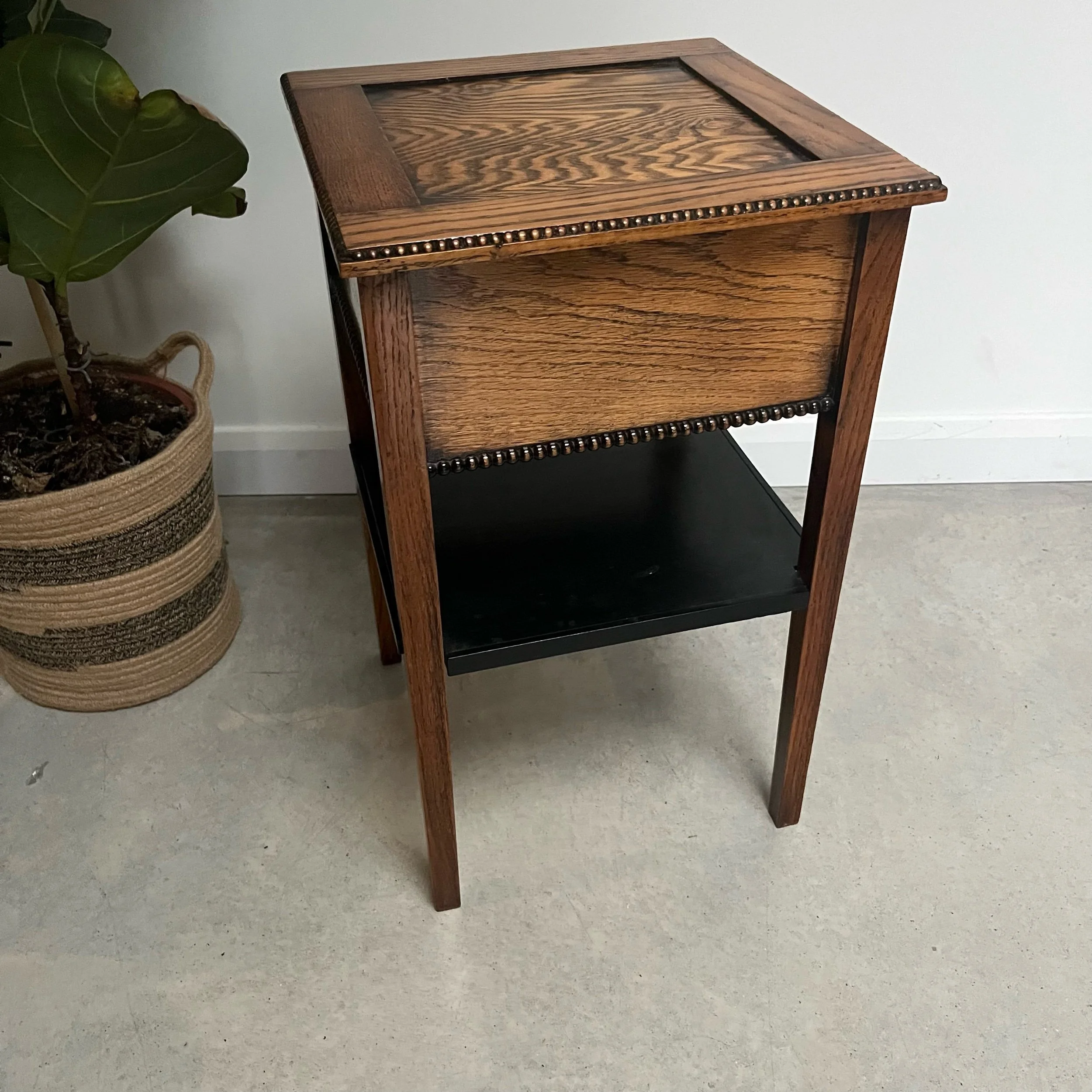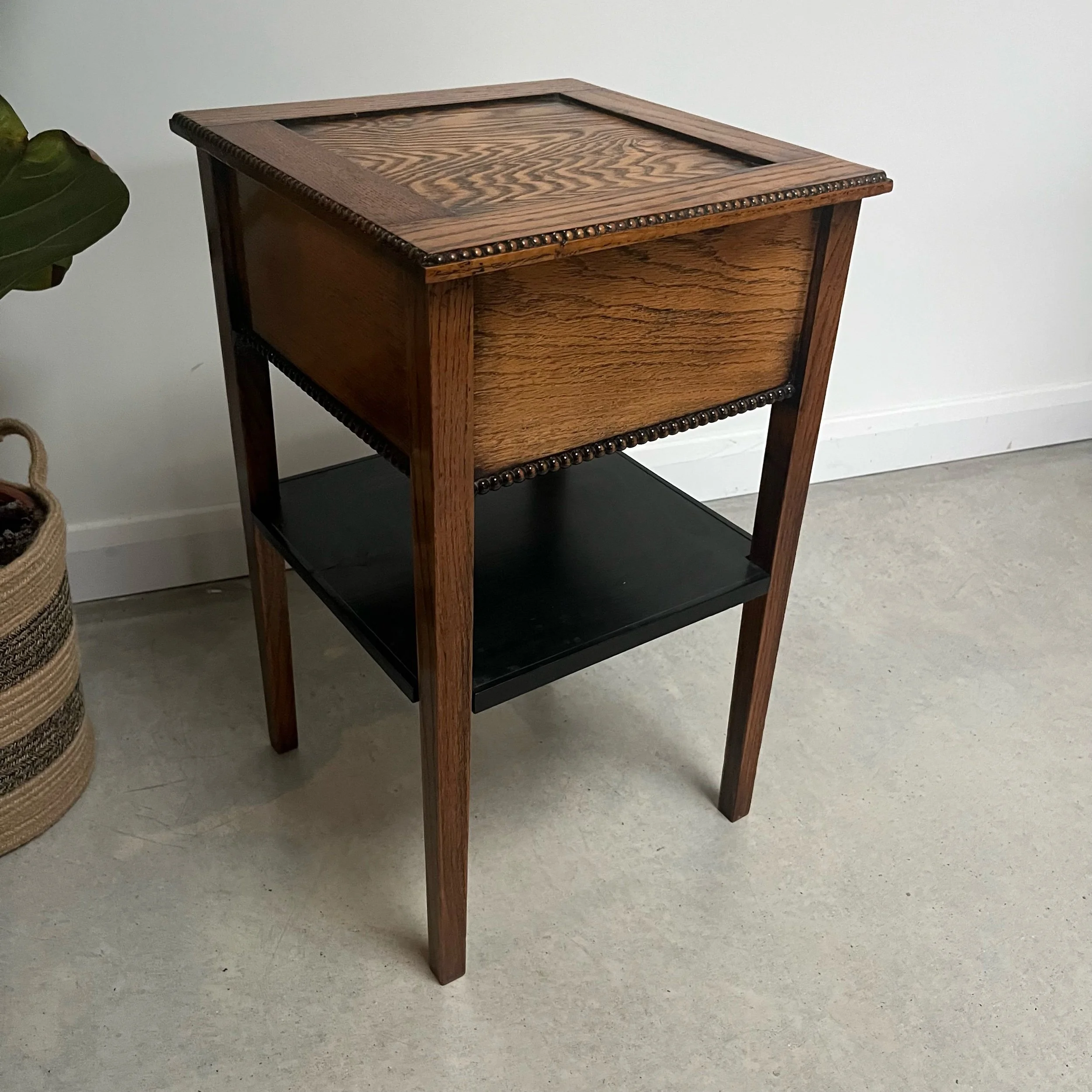 Arts and Crafts Vintage Oak Studded Side Sewing Table Two Tier Ebonised Shelf