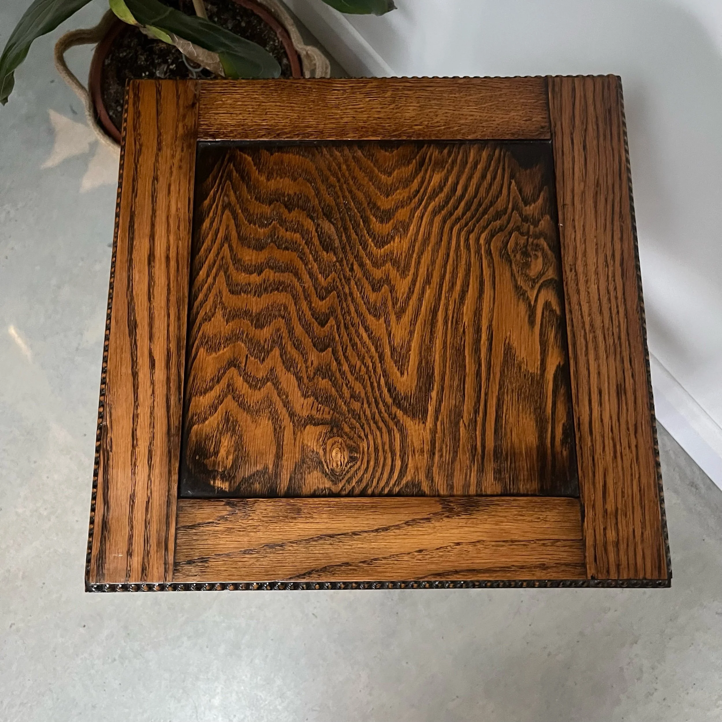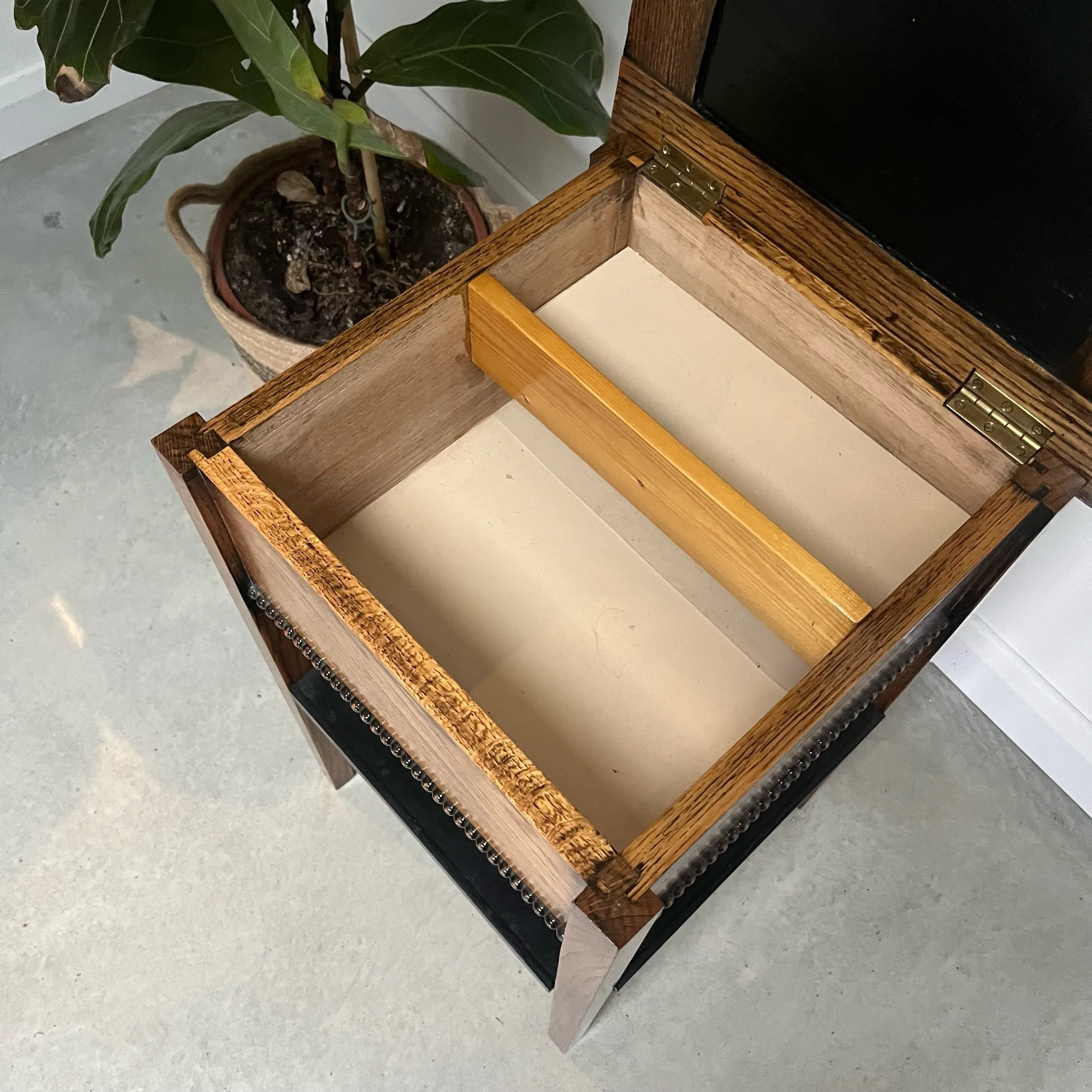 The studded detailing adds a touch of arts and crafts charm, making it both functional and stylish as a side table or sewing table.