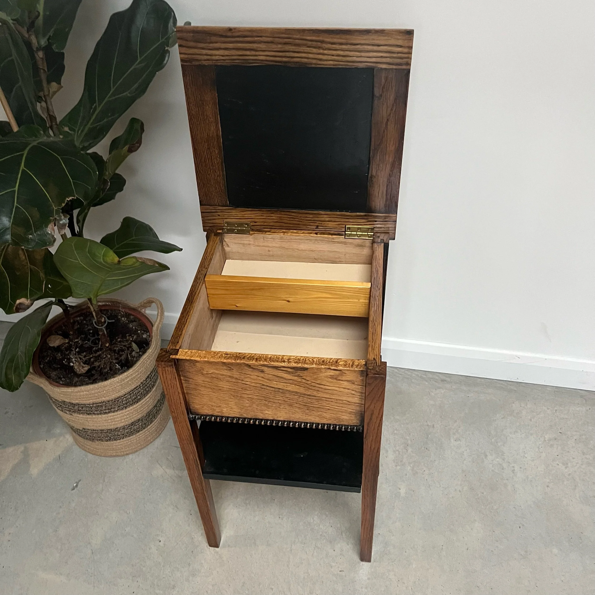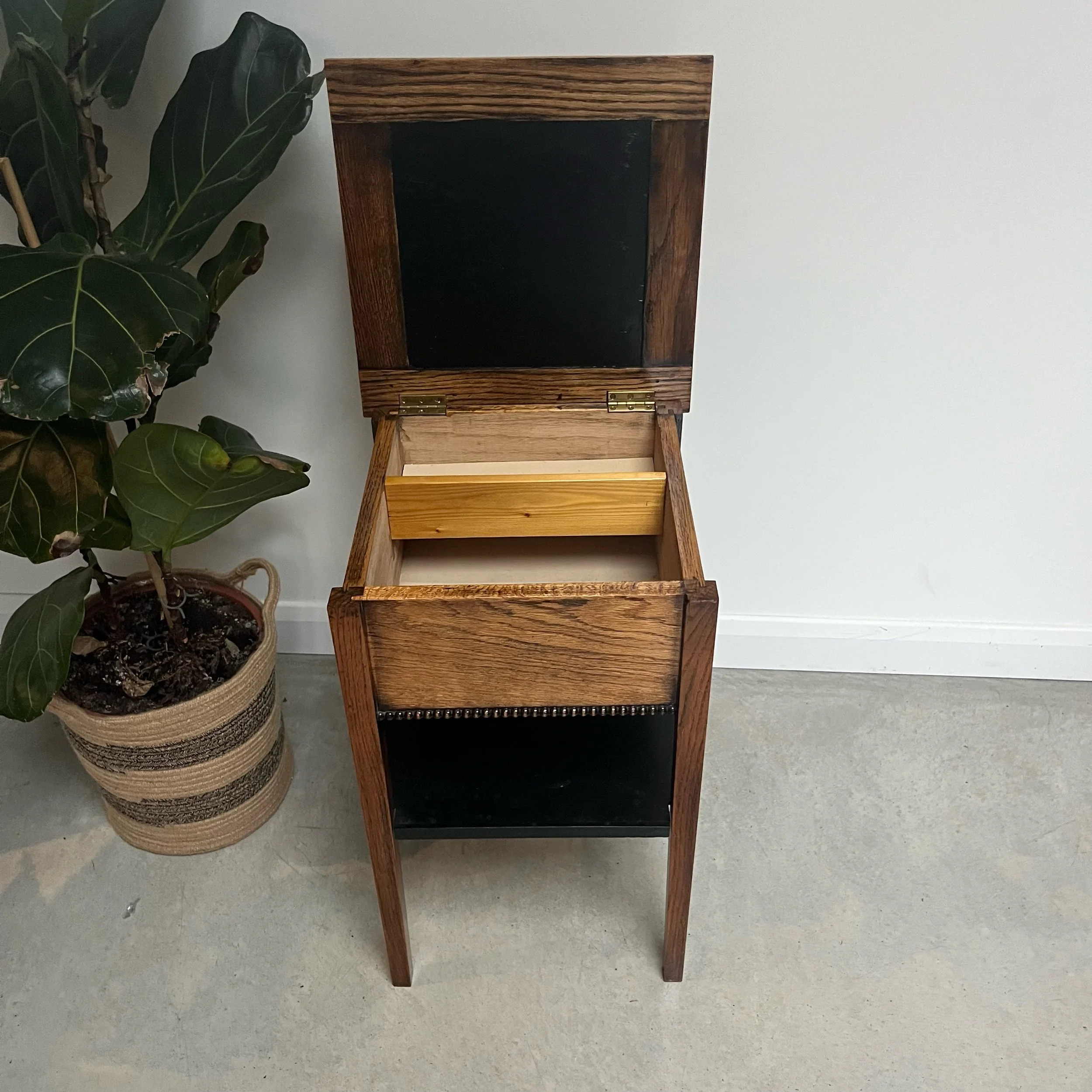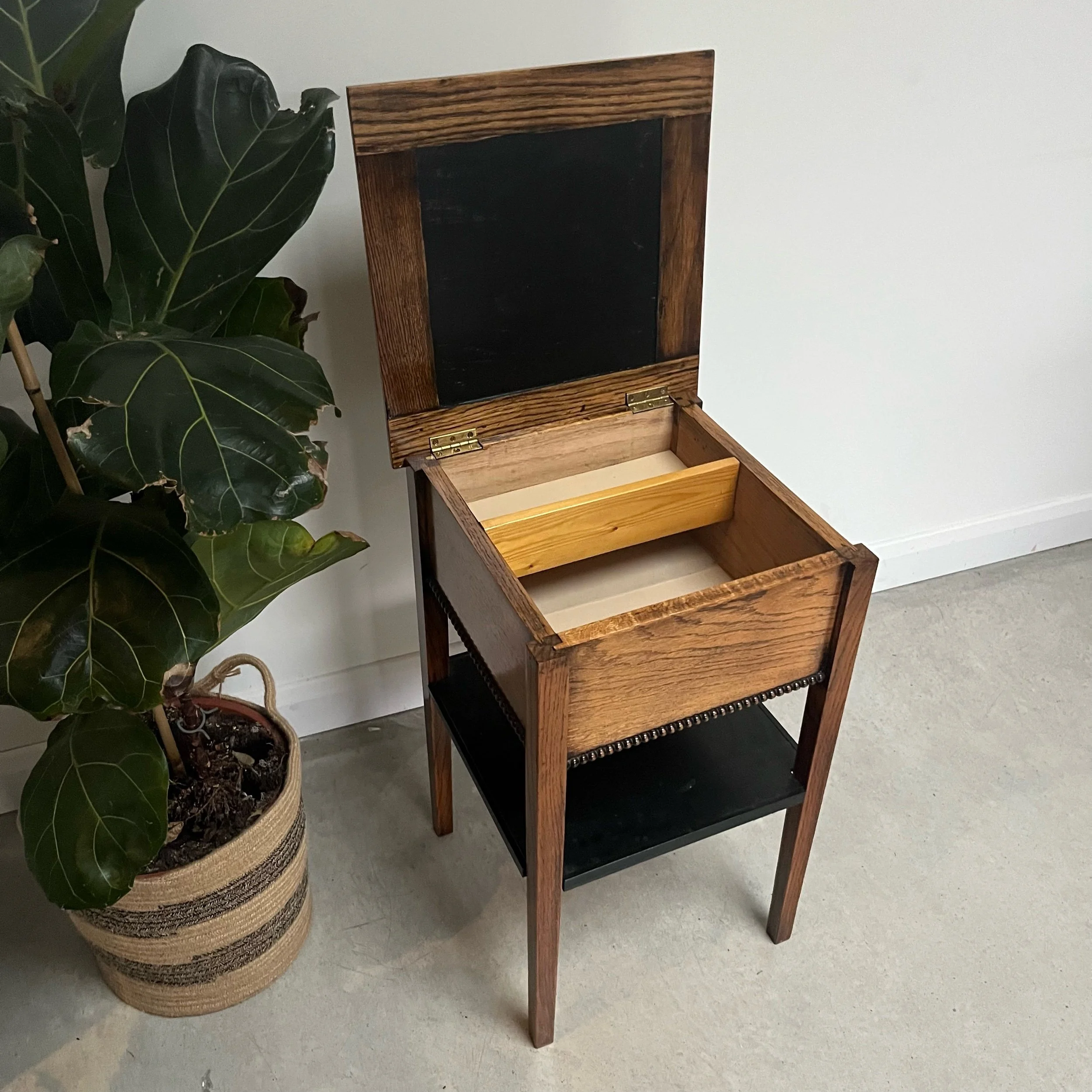 Crafted from solid oak, this vintage sewing table features a unique two-tier lower ebonised shelf, and a convenient storage box under the lid of the top oak surface for other essentials.
