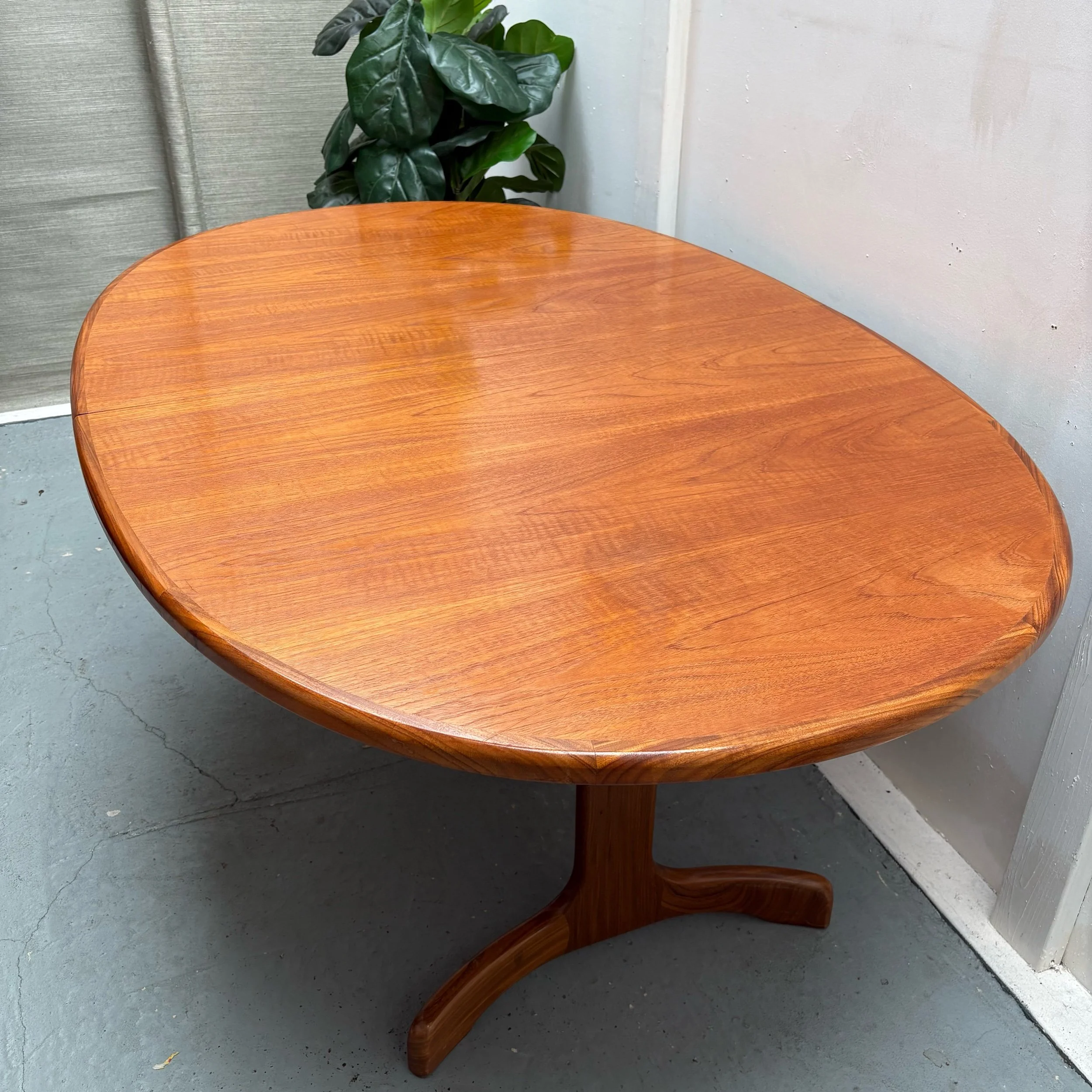 This table is a fine example of midcentury modern design, combining practicality with elegant simplicity. The table features an oval top with a warm teak finish that highlights the natural wood grain.