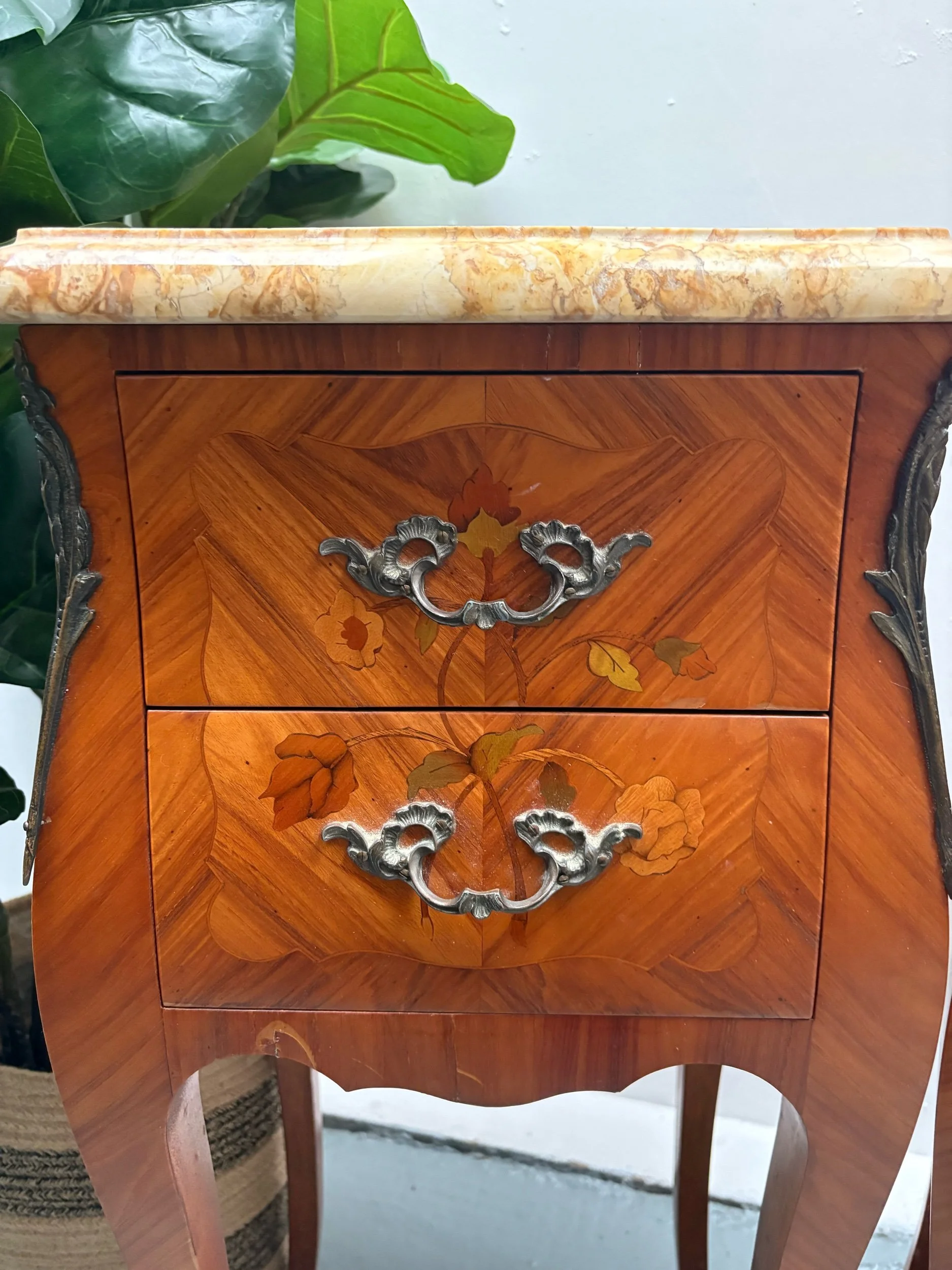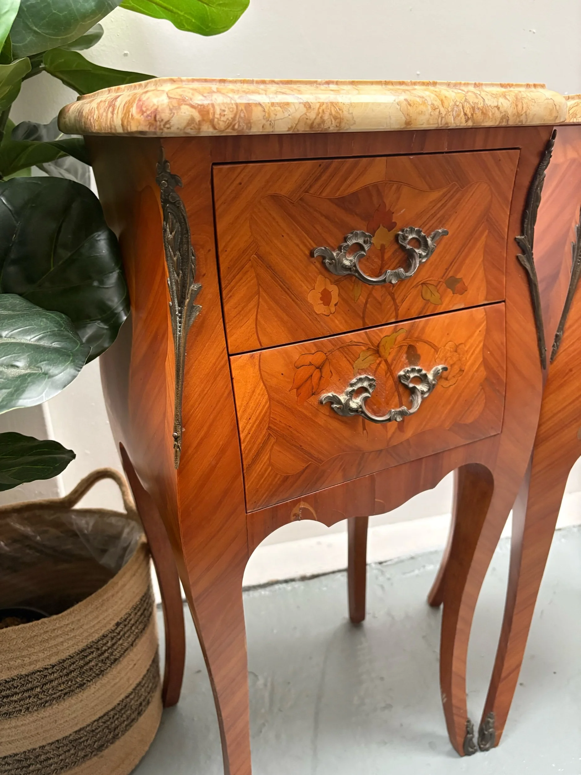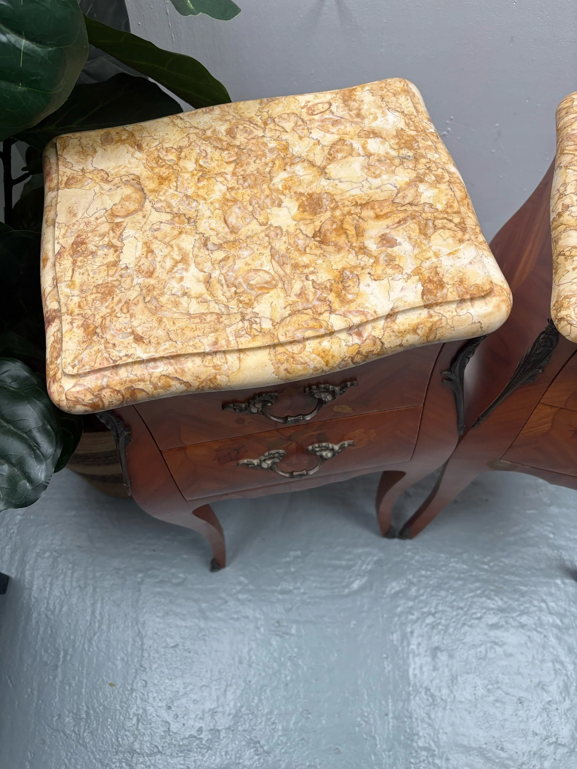 Beautiful pair of tulipwood night antique tables, having serpentine marble tops above 2 flower inlaid drawers fitted with original brass handles and flanked by ormolu decoration, all standing on slender cabriole legs.