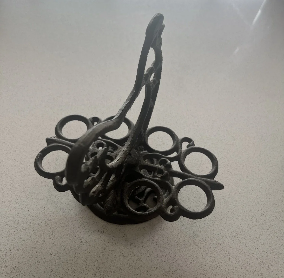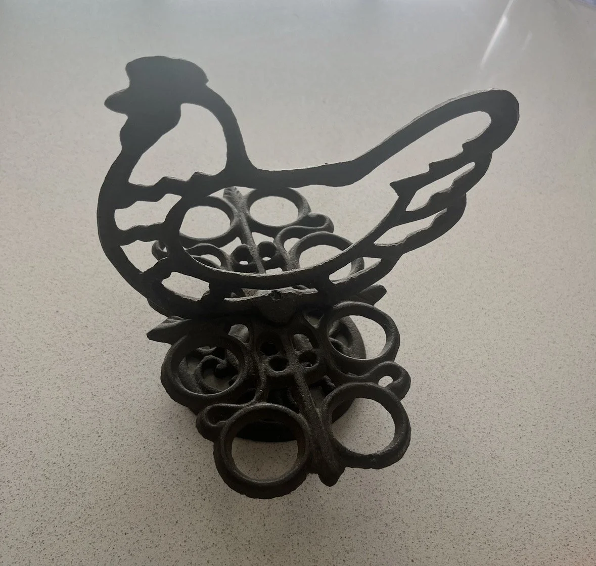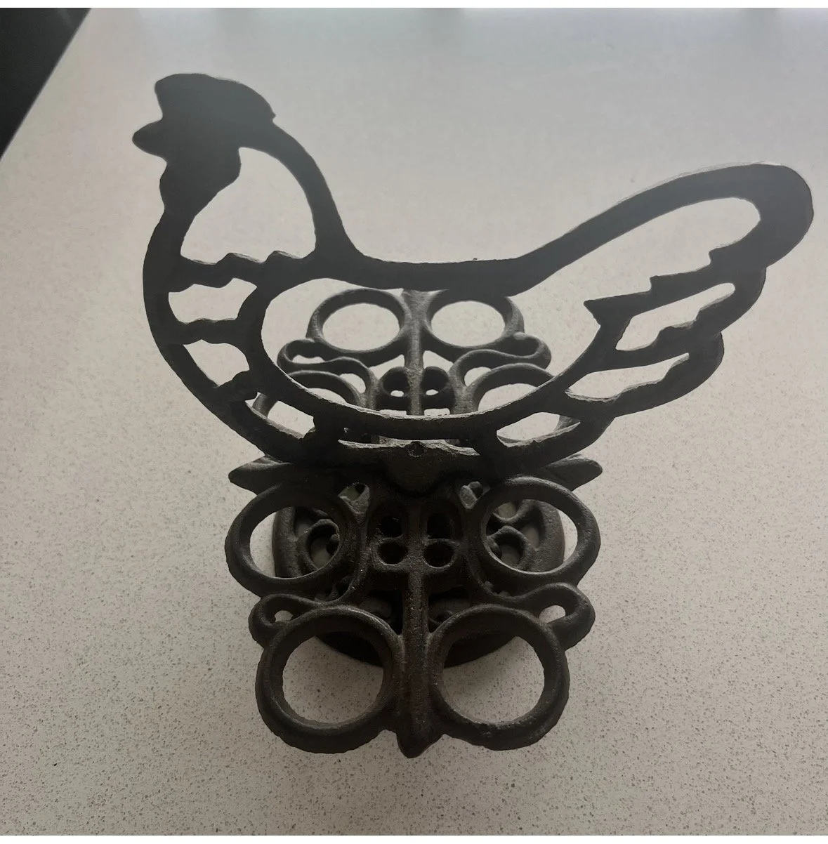 This French Vintage Cast Iron Chicken Shaped 8 Egg Holder Rack is a charming addition to any kitchen.