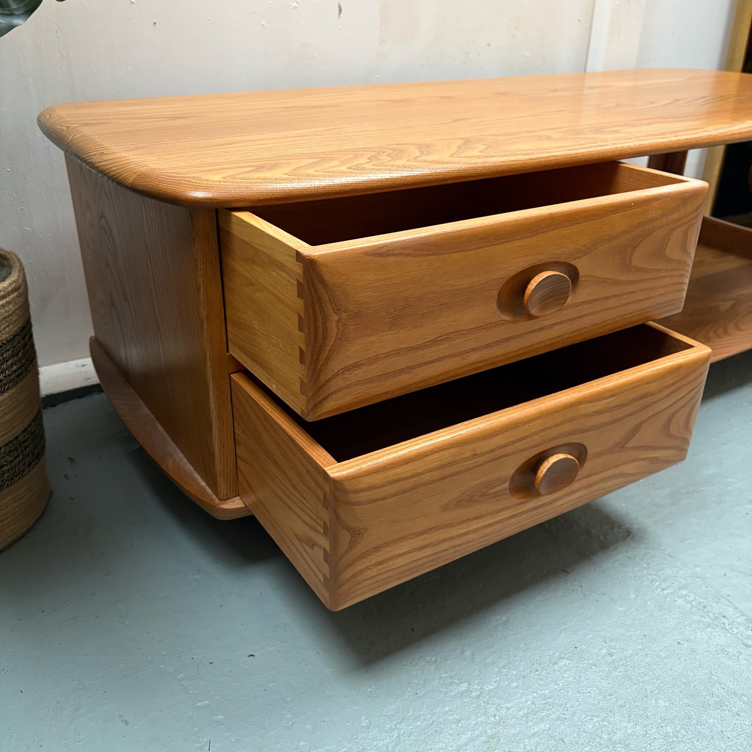 Featuring double drawers beside a handy magazine storage cavity below the table top, all finished in Ercol's popular light blonde hue.