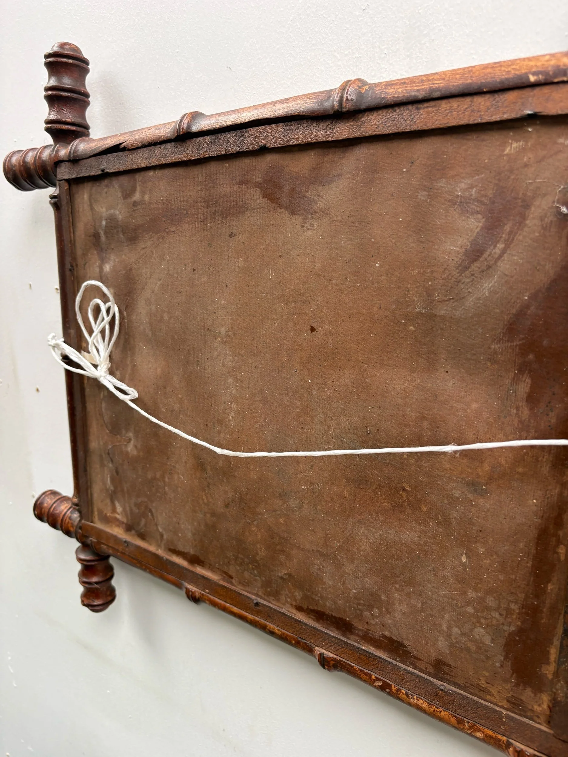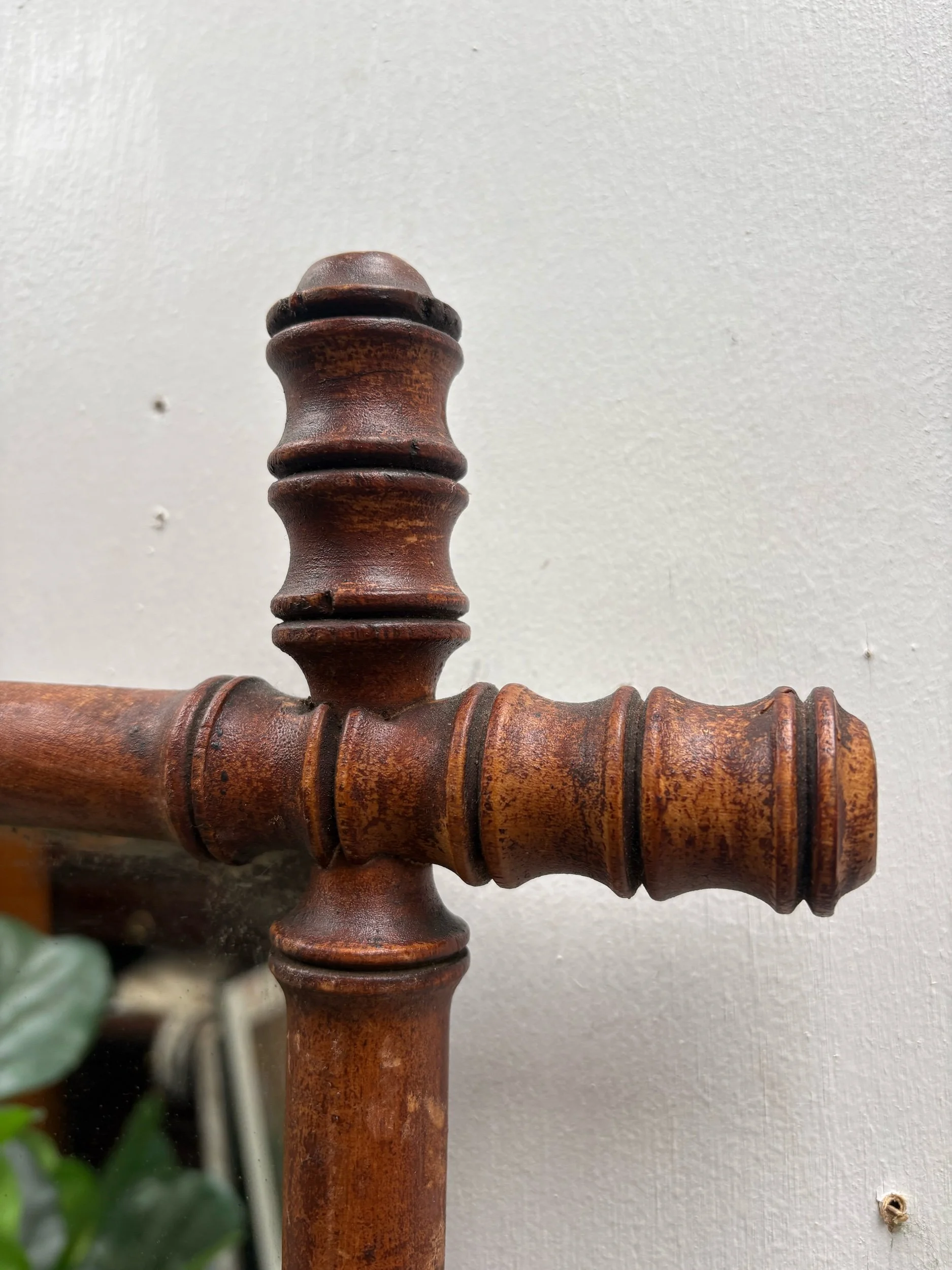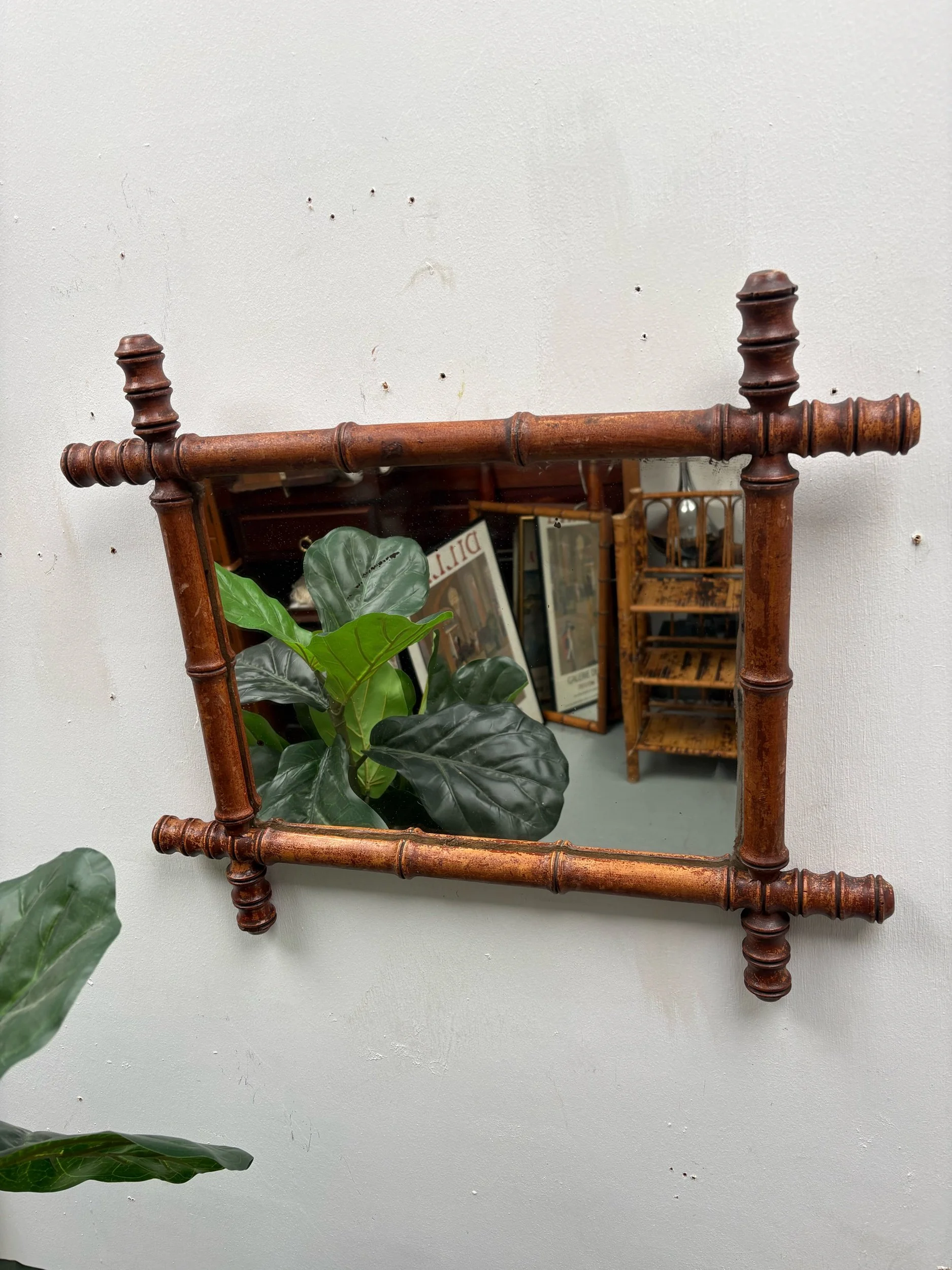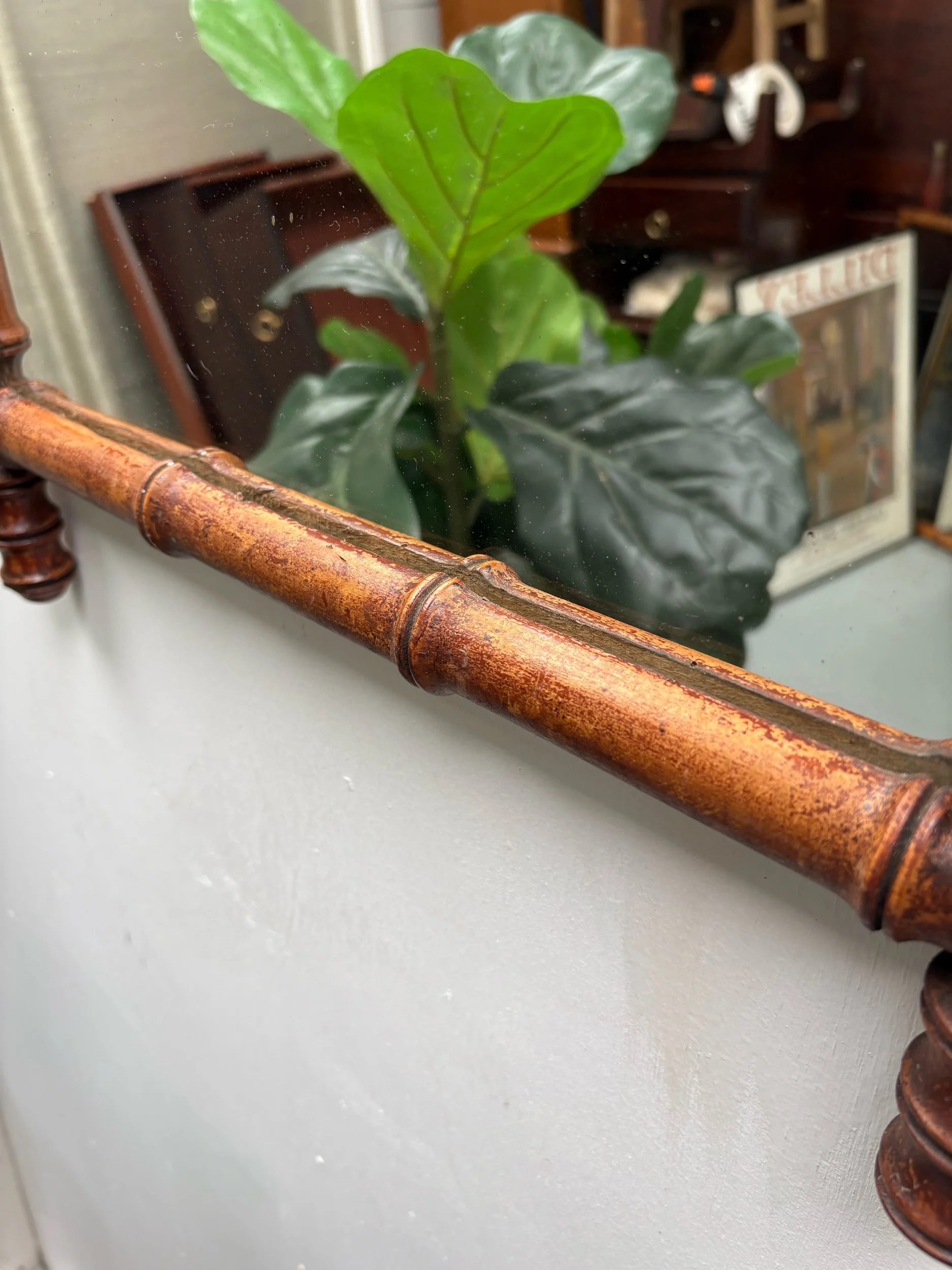 Infuse your interiors with a dash of antique French elegance with this walnut faux-bamboo mirror. Its rich brown hue, reeded accents, and authentic patina make it a must-have piece for those in quest of historical charm and timeless grace.