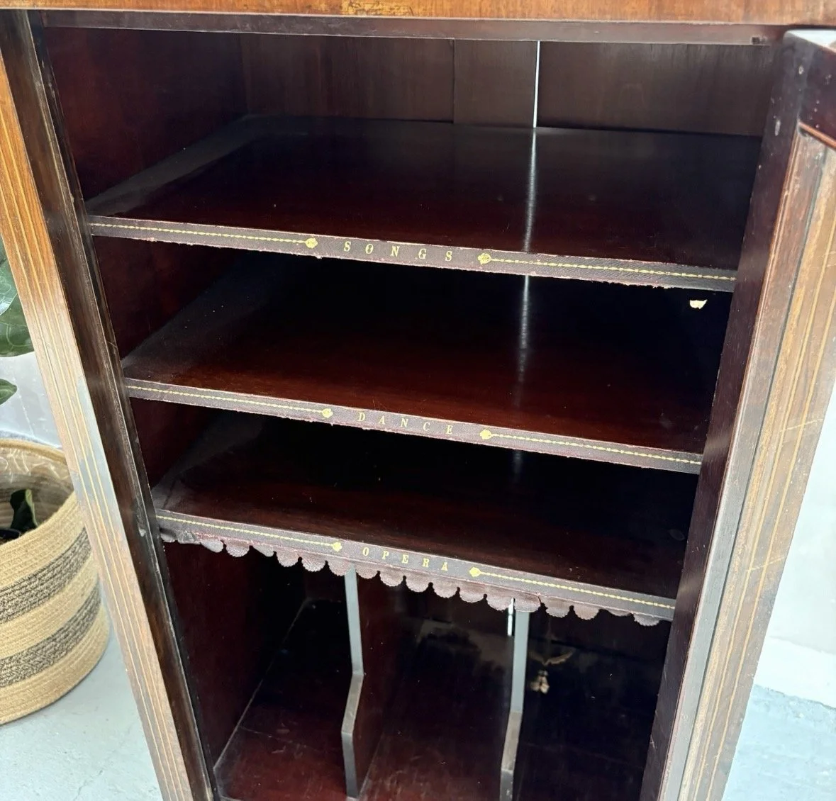 Standing upon shaped bracket feet at each corner with a plinth apron at the rear. This is an attractive antique music cabinet, with exquisite inlay and dashing Rosewood stocks. Solid joints and construction, delivered waxed, polished, and ready for the home.