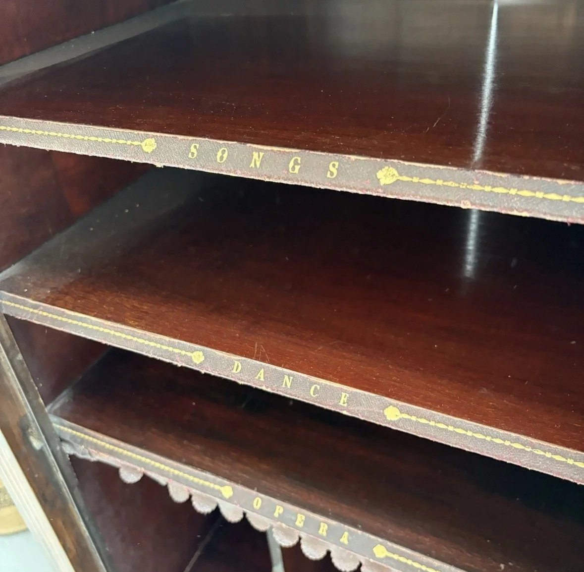 Decorated with further boxwood stringing on the door and fascia. The interior is arranged as a suite of three shelves over three tall compartments, with leather-dressed edges to help catalog your music into Songs, Operas, and Overtures respectively.