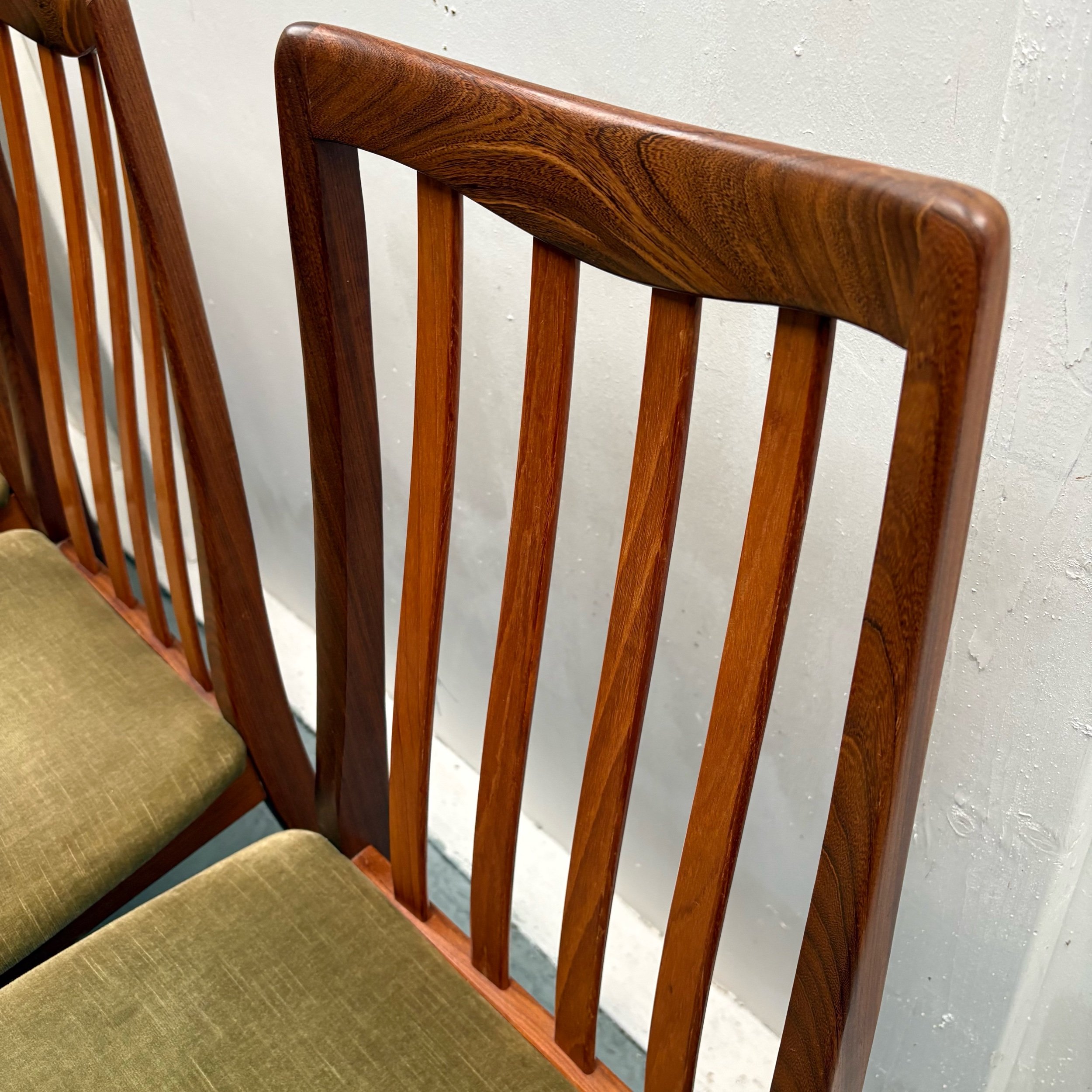Crafted with a stunning solid teak and Afromosia frame showcasing a captivating wood grain, these chairs boast high slat backs and are upholstered in a charming sage green velour.